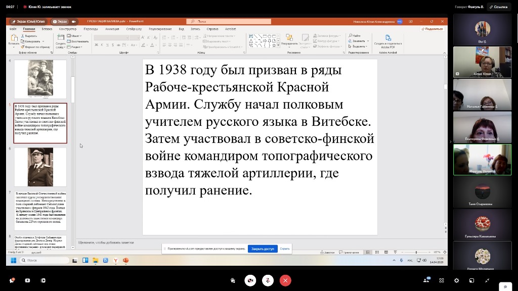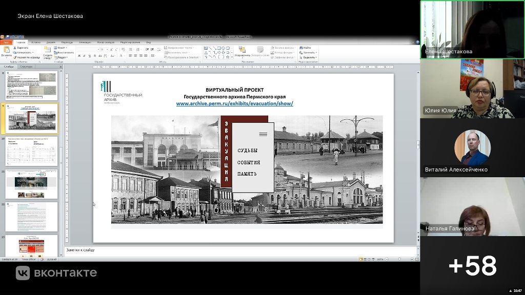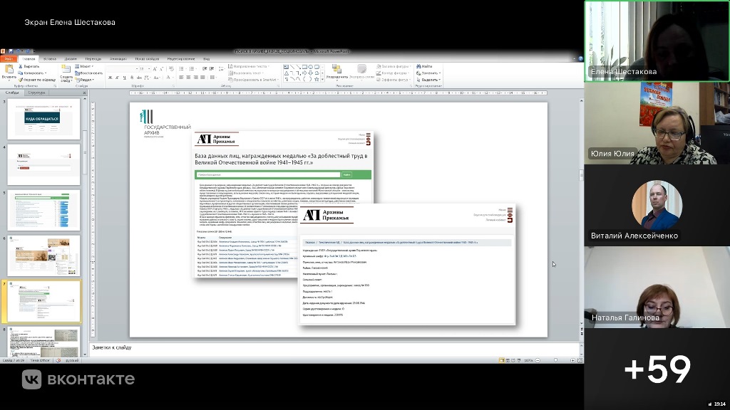 В рамках онлайн разговора заместитель директора (по науке и связям с общественностью) Государственного архива Пермского края Елена Шестакова сделала обзор архивных ресурсов для поиска информации по Великой Отечественной войне. В обзор вошли проекты «Поколения Пермского края» и виртуальный проект «Эвакуация: судьбы, события, память». Особый интерес вызвала новая база данных о лицах, награжденных за доблестный труд в Великой Отечественной войне 1941-1945 гг., открытая краевым архивом в 2025 г. Также по просьбе территорий архивист рассказала о том, как составлять и отправлять запросы в разные архивы региона и России, какие краевые и общероссийские ресурсы помогают реконструировать биографию участников Великой Отечественной войны.