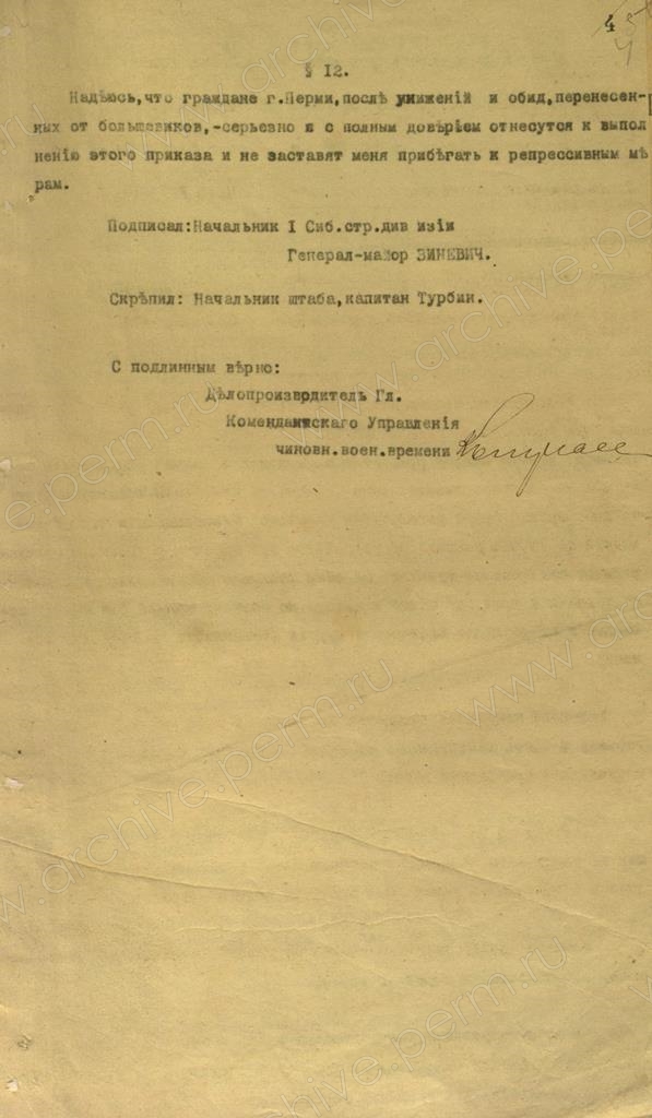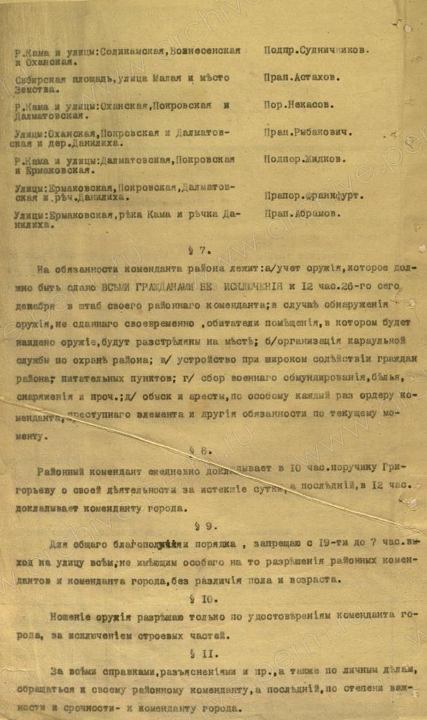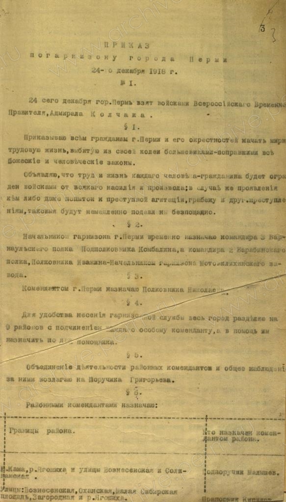 5. Приказ Верховного правителя Александра Колчака по гарнизону города Перми. 24 декабря 1918 г. // ГАПК. Ф. р-746. Оп.2. Д.8. Л.3-4.