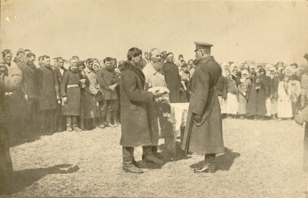 4. Крестьяне на встрече с А.В. Колчаком преподносят хлеб-соль. Пермская губерния, 1919 г. // ГАПК. Ф. ф-61. Оп.61п. Д.98.