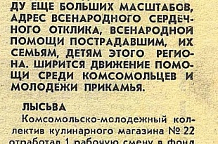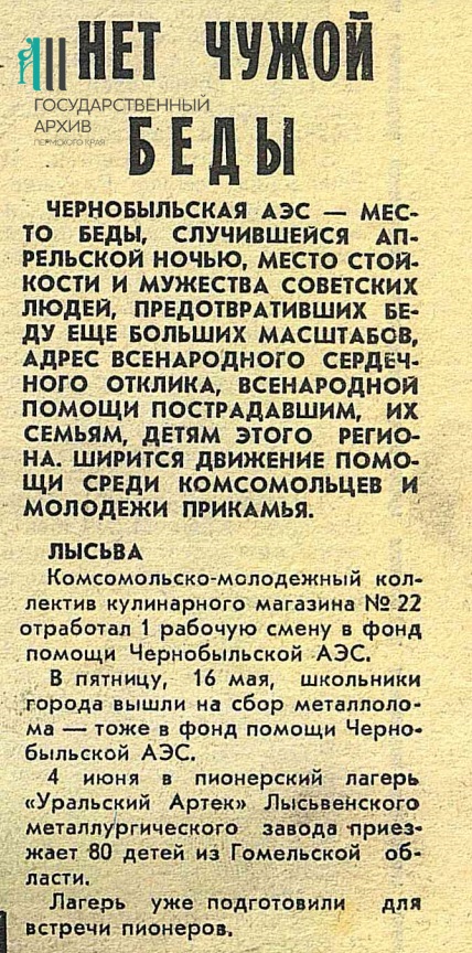 С середины мая 1986 г., когда масштаб аварии был окончательно публично признан советскими властями, множество организаций по всему СССР организовывали сбор средств для пострадавших от катастрофы, для переселяемых жителей Полесья. Не остались в стороне и жители Пермской области. Также, уже в начале июня 1986 г. пионерский лагерь «Уральский Артек» в Лысьвенском районе принял детей из Гомельской области.