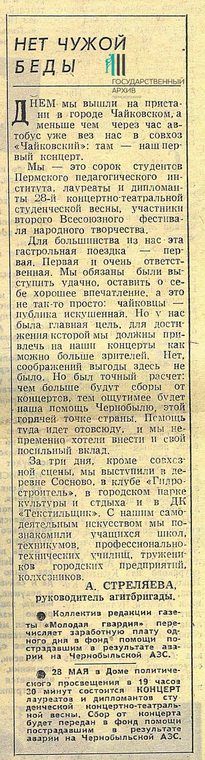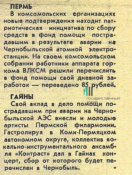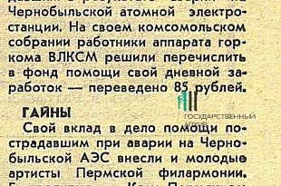 Публикации о помощи пострадавшим после катастрофы на ЧАЭС из пермской газеты «Молодая гвардия», май 1986 г. ГАПК. ФПИ. №3202. №59-60.