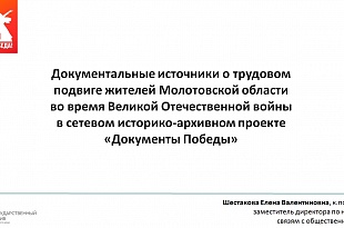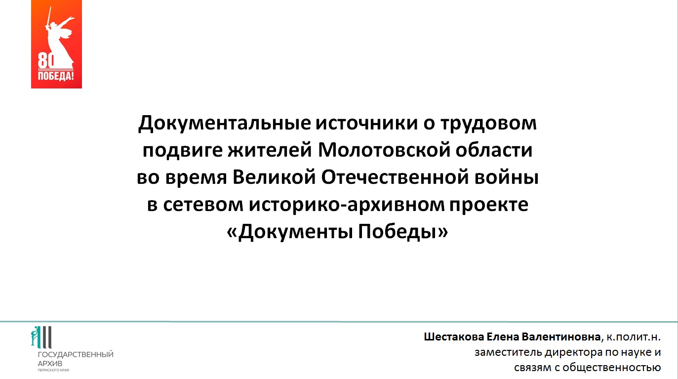 Заместитель директора по науке и связям с общественностью, к.полит.наук Елена Шестакова в рамках секции «Единство фронта и тыла: документальные источники о подвиге трудящихся СССР в годы Великой Отечественной войны» в дистанционном формате представила сетевой историко-архивный проект «Документы Победы». Данный проект реализуется Государственным архивом Пермского края совместно с Агентством по делам архивов Пермского края и муниципальными архивами к 80-летию Победы в Великой Отечественной войне и посвящен помощи территорий Пермского края в достижении Победы.