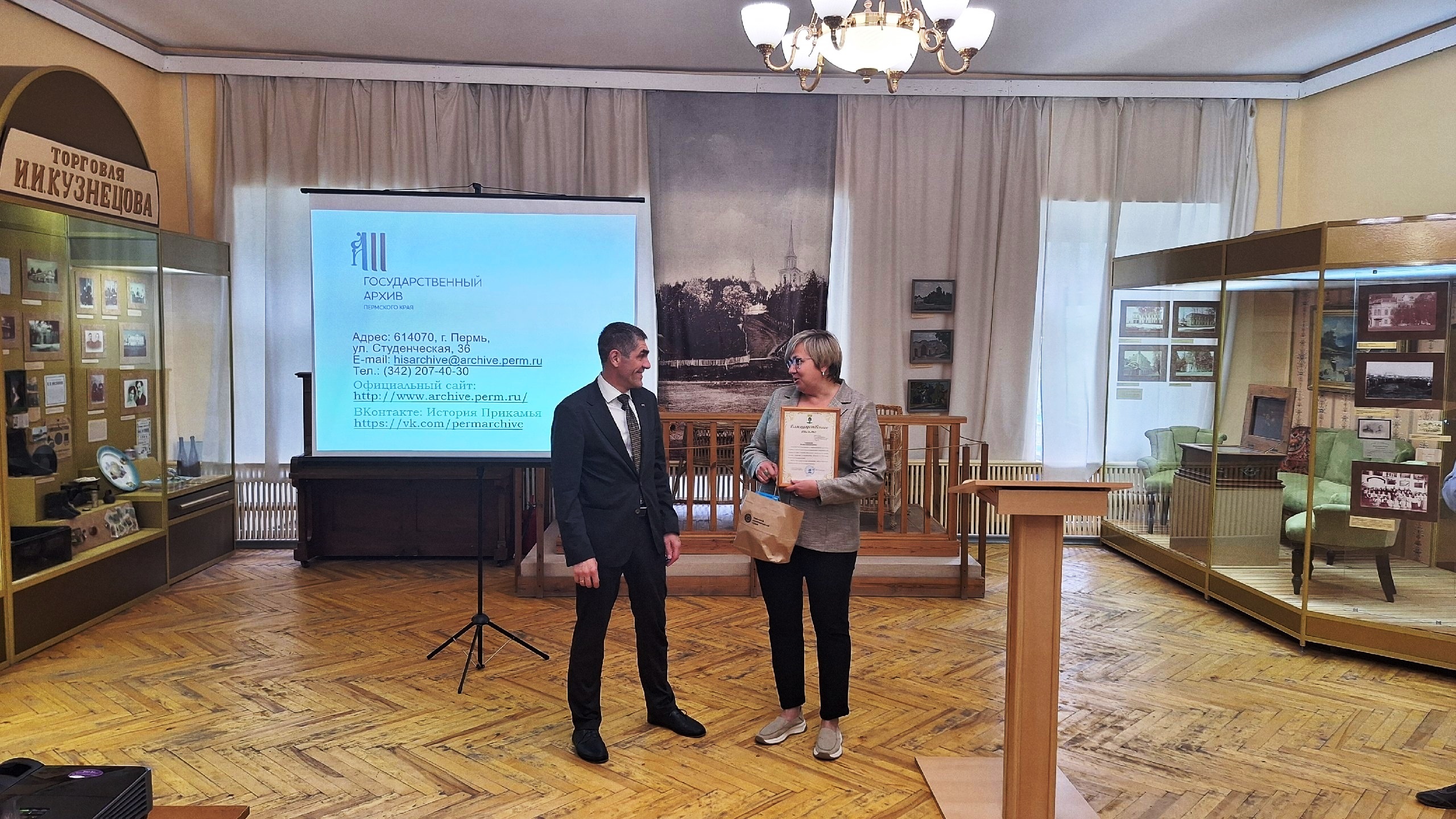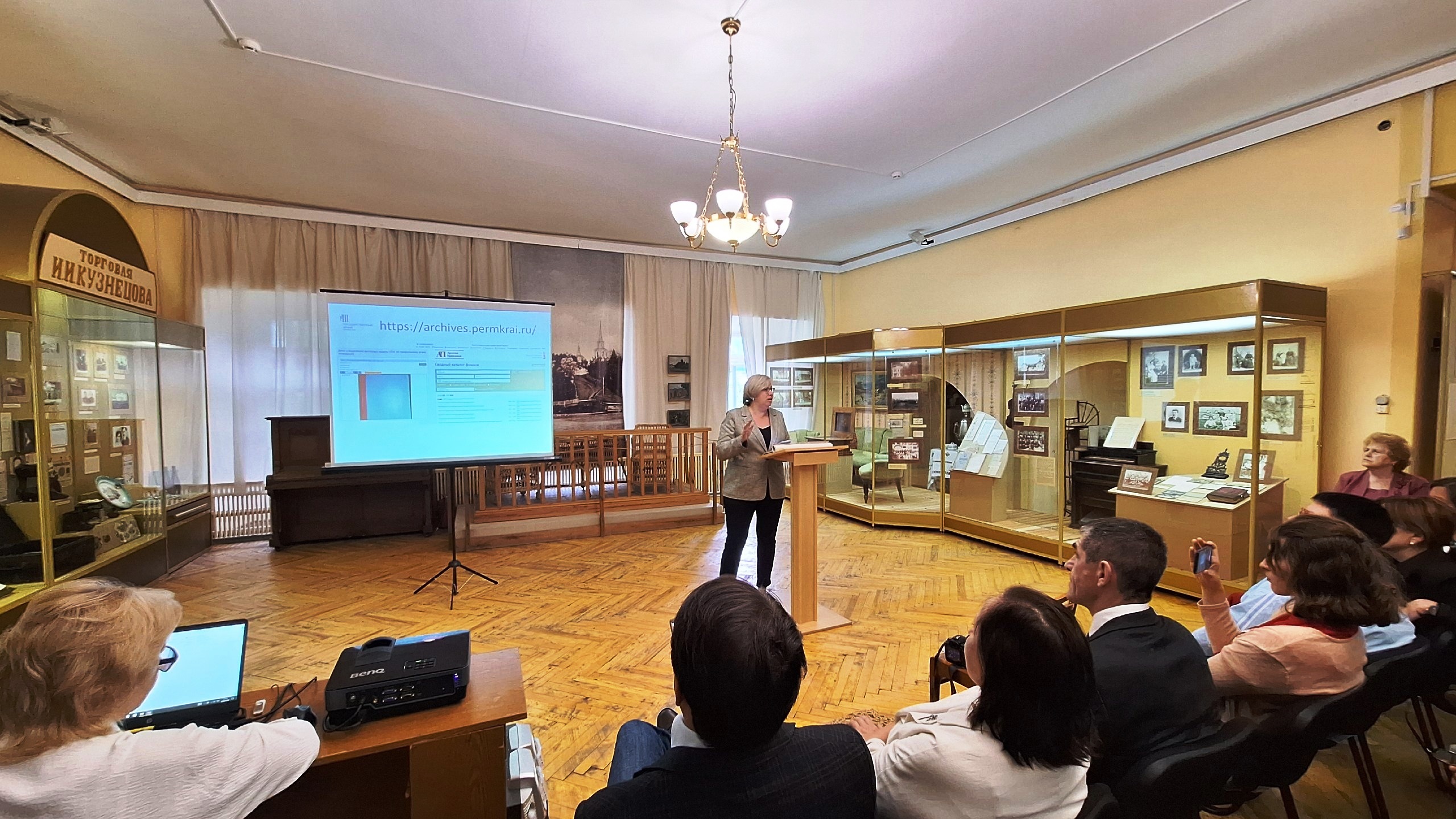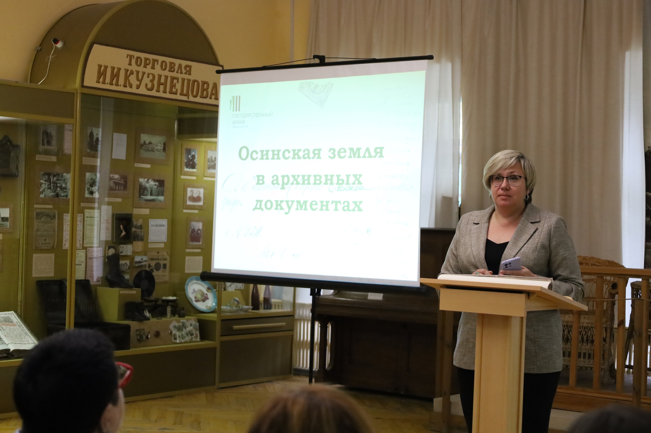 Директор Государственного архива Пермского края, к.истор.наук Юлия Кашаева представила доклад о наиболее значимых фондах архива по истории Осы и других населенных пунктов Осинского городского округа.