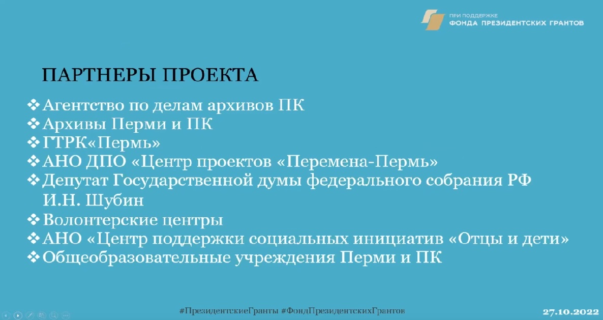 27 октября был запущен историко-архивный проект для школьников Пермского края #ЖИВОЕДЕТСКОЕ. Цель проекта – актуализация сведений о детях, внесших вклад в становление и развитие города Перми и Пермского края. В 2022–2023 гг. участниками проекта станут более 3 тысяч учеников.