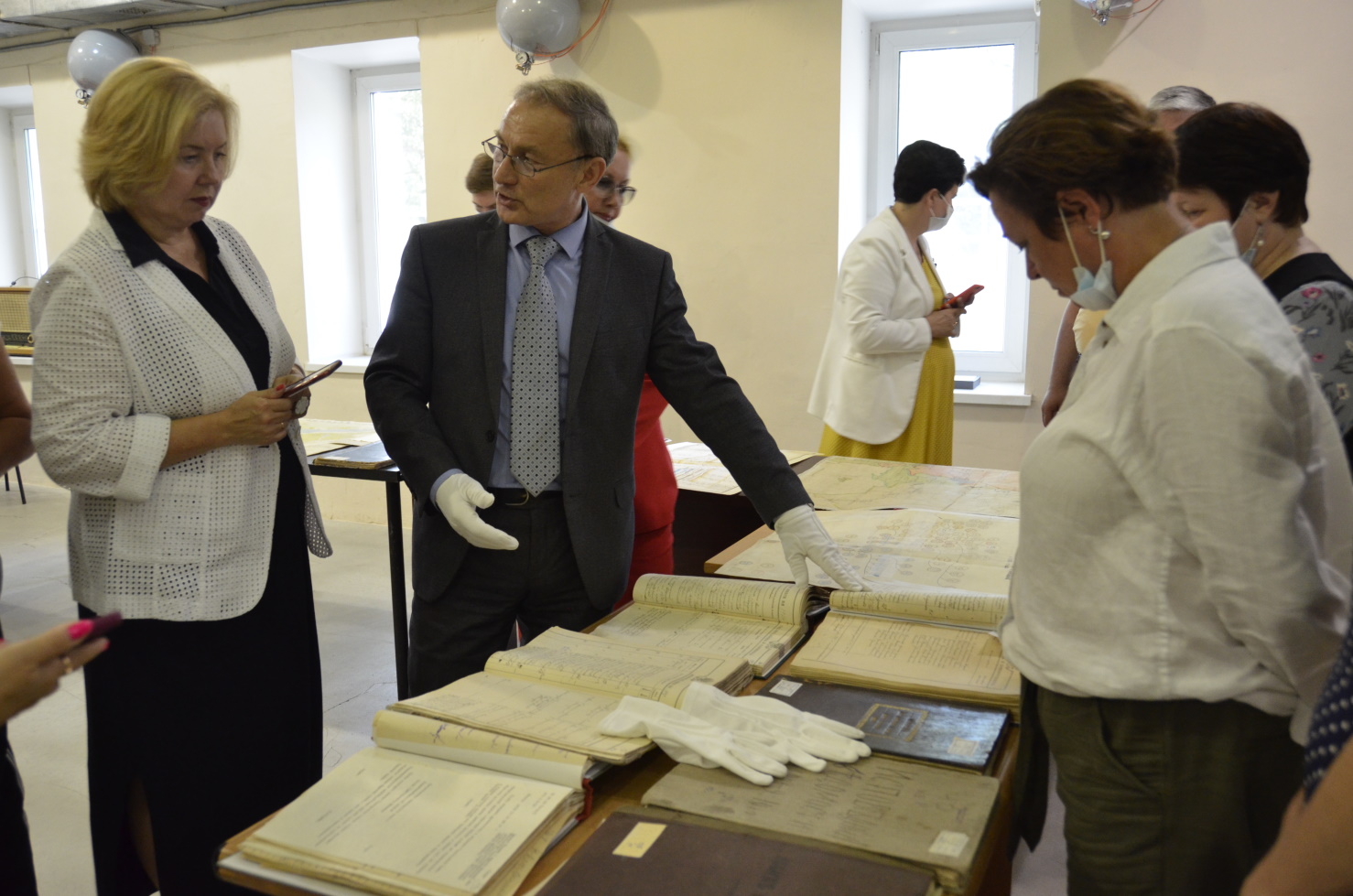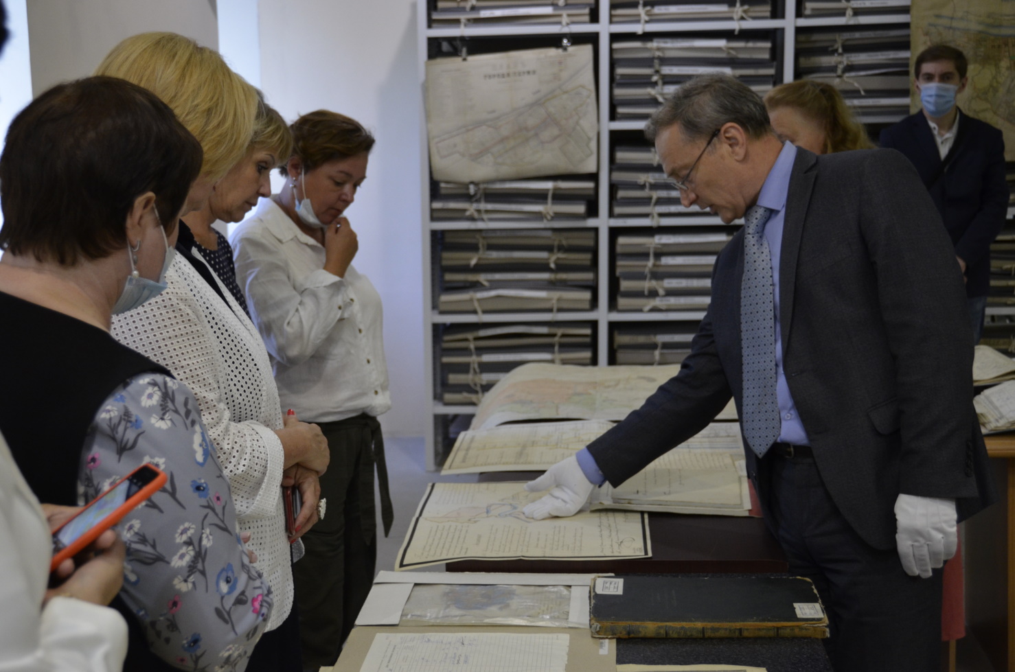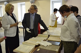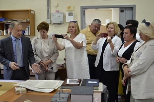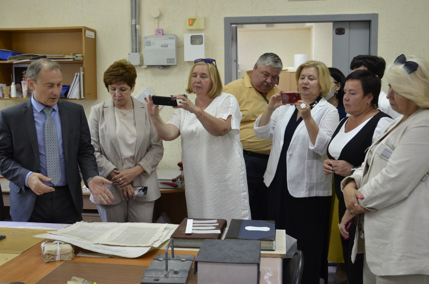 Игорь Вячеславович Киреев, директор ГАПК, провел для гостей обзорную экскурсию по архиву. Экскурсанты успели побывать в современных читальных залах, в лаборатории по реставрации документов и в архивохранилище, где смогли посмотреть интересные документы по истории Прикамья и образования в Пермской губернии.