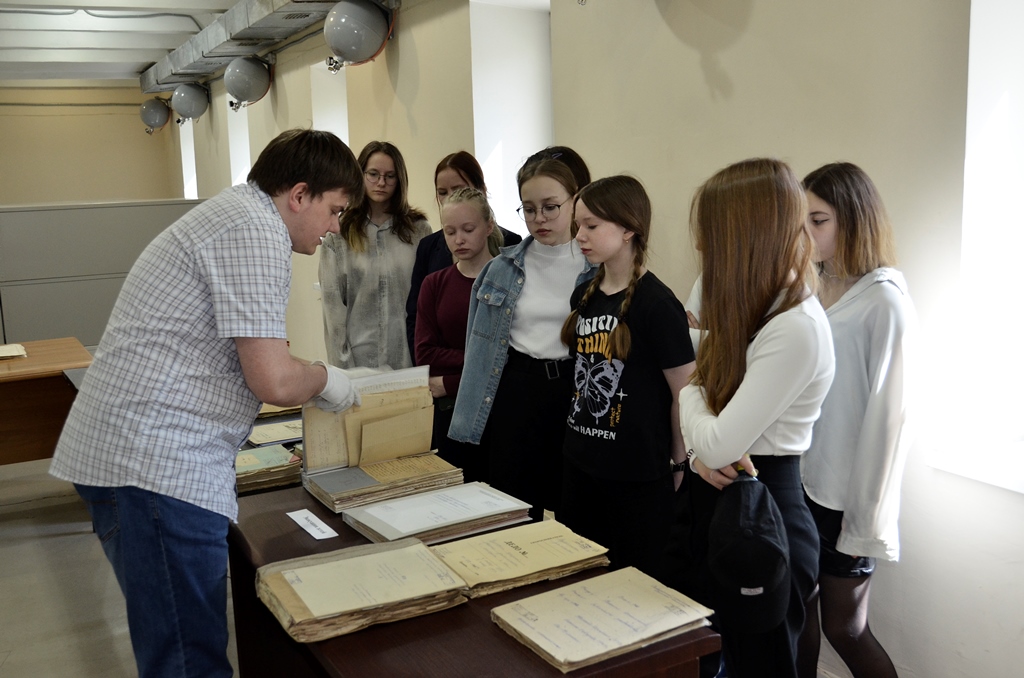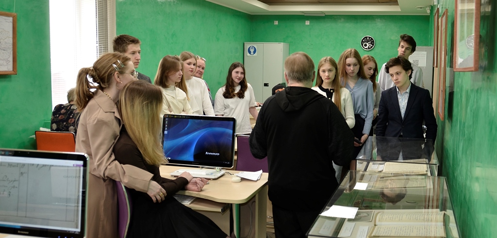 3 мая в Государственном архиве Пермского края состоялись тематические экскурсии для учащихся седьмых и девятых классов Гимназии № 5 г. Перми, посвящённые грядущей 78-й годовщине Победы в Великой Отечественной войне. Экскурсию провели главный археограф сектора читальных залов Олег Петухов и главные археографы научно-исследовательского отдела Владимир Арестов и Виталий Сарабеев.