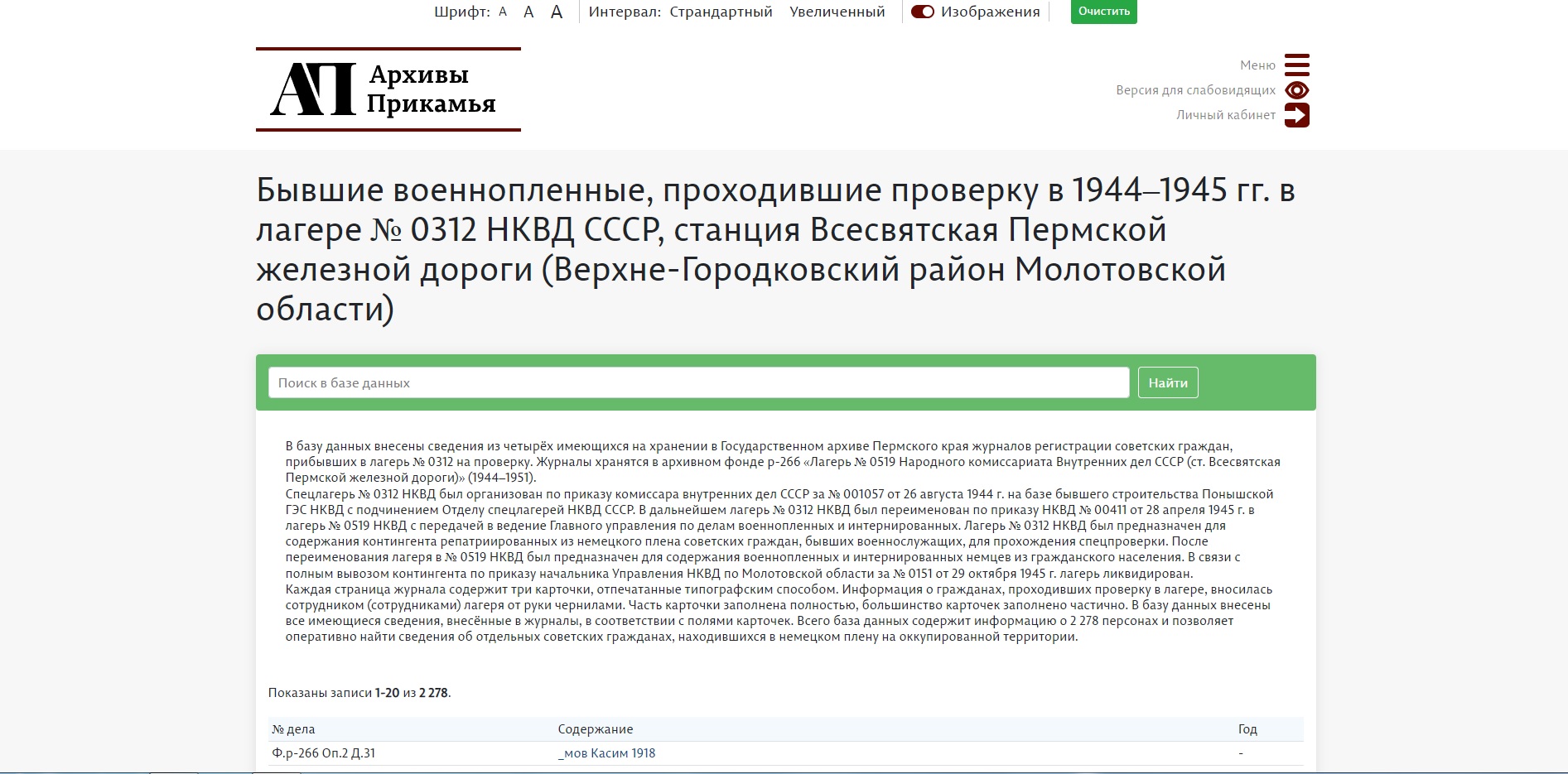 Всего база данных содержит информацию о 2278 персонах и позволяет оперативно найти сведения об отдельных советских гражданах, находившихся в немецком плену на оккупированной территории.