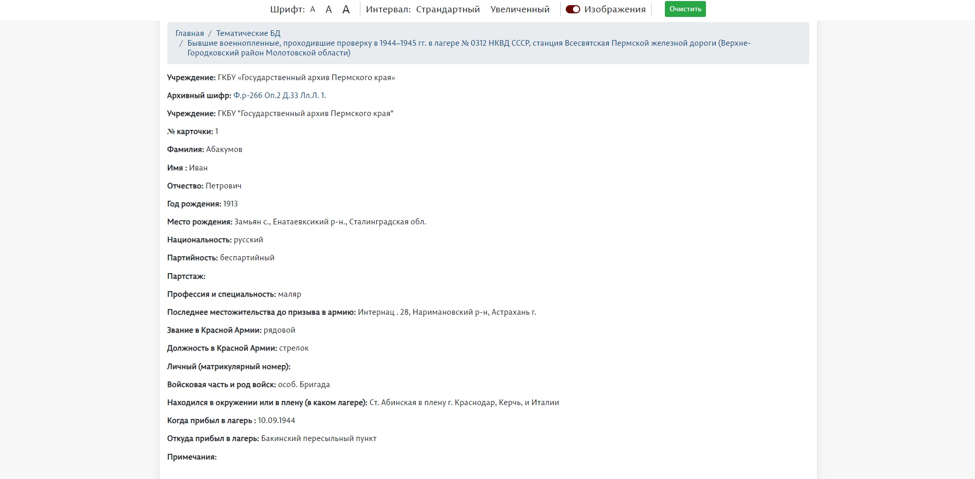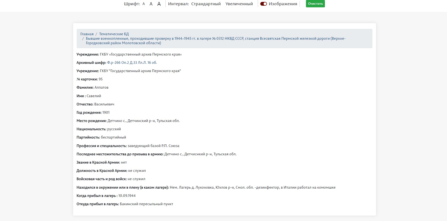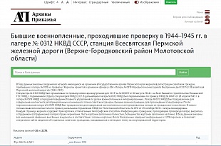 На интернет-портале Единой автоматизированной информационной системы «Архивы Прикамья» в разделе «Тематические базы данных» размещена база данных «Бывшие военнопленные, проходившие проверку в 1944–1945 гг. в лагере № 0312 НКВД СССР, станция Всесвятская Пермской железной дороги (Верхне-Городковский район Молотовской области)».