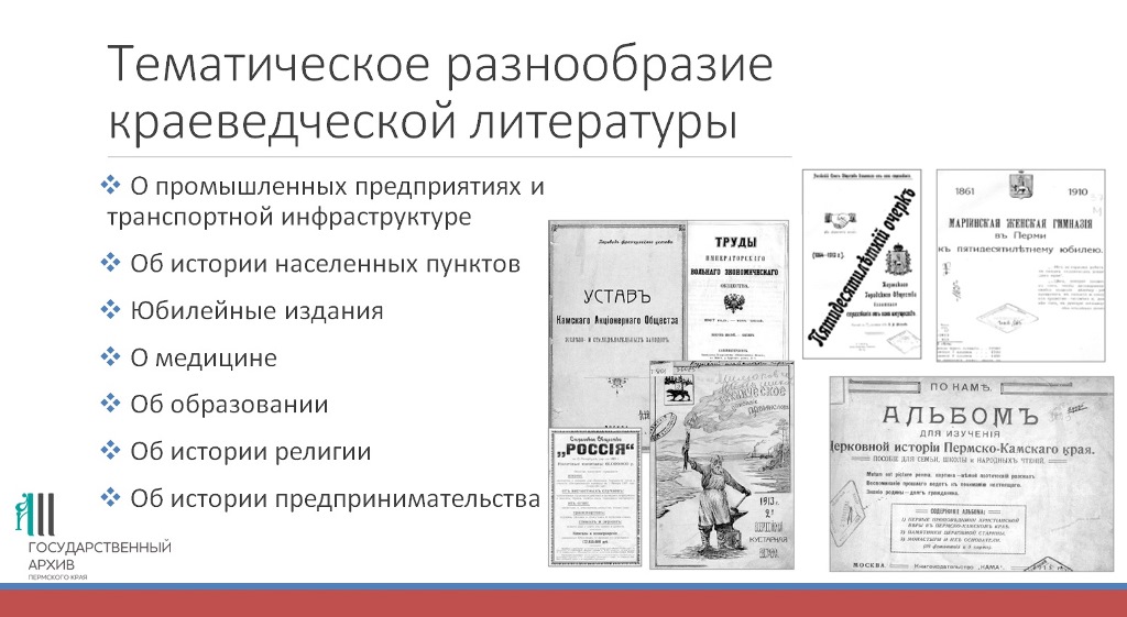 Среди особо ценных изданий ГАПК можно выделить Кириллические книги: «Последование молебных пений» (1771), Димитрий Ростовский. «Книга житий святых» (1782), Кормчая (1787), Петр Хрисолог. Поучительные слова (1794); издания XVIII – начала XX вв., пермские и периодические издания XIX – XX вв. Также в архиве представлено тематическое разнообразие краеведческой литературы: о промышленных предприятиях и транспортной инфраструктуре, об истории населенных пунктов, юбилейные издания, о медицине, об образовании, об истории религии и истории предпринимательства и т.д.