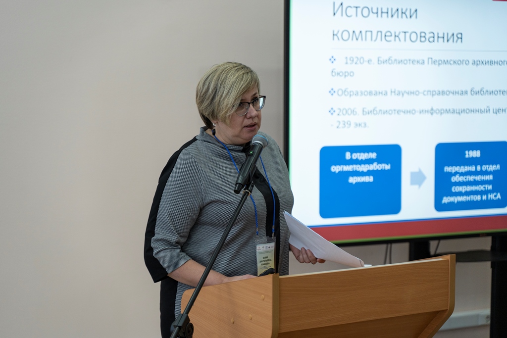 В рамках пленарного заседания Юлия Кашаева, кандидат исторических наук, директор Государственного архива Пермского края, раскрыла вопросы комплектования и использования печатных изданий из фондов ГАПК. По представленным данным в Фонде печатных изданий на 2023 год находится около 72 тысяч единиц хранения: книги и брошюры, газеты, журналы и другие печатные издания. Источниками комплектования ФПИ являются издания Государственного архива Пермского края, издания других архивов и организаций, переданные на мероприятиях в дар, книги, поступающие в составе личных фондов и книги исследователей, созданные на документах.