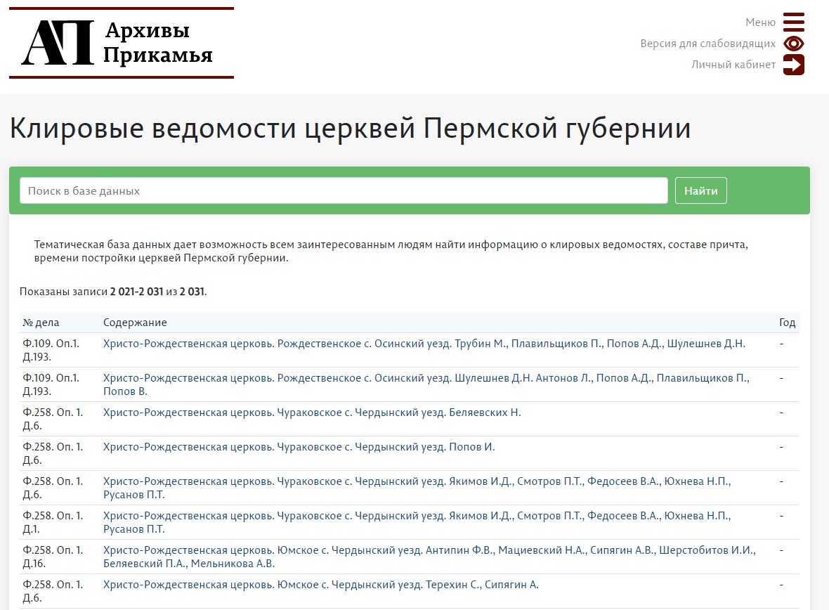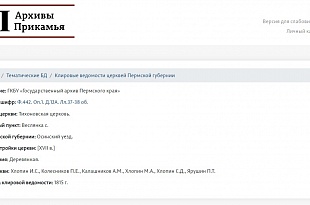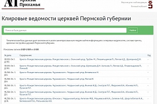 Заполнение данных для тематической базы данных «Клировые ведомости церквей Пермской губернии» было начато Государственным архивом Пермского края в 2020 г. За 2023 год в базу было внесено 530 записей, всего в ней находится 2031 запись.