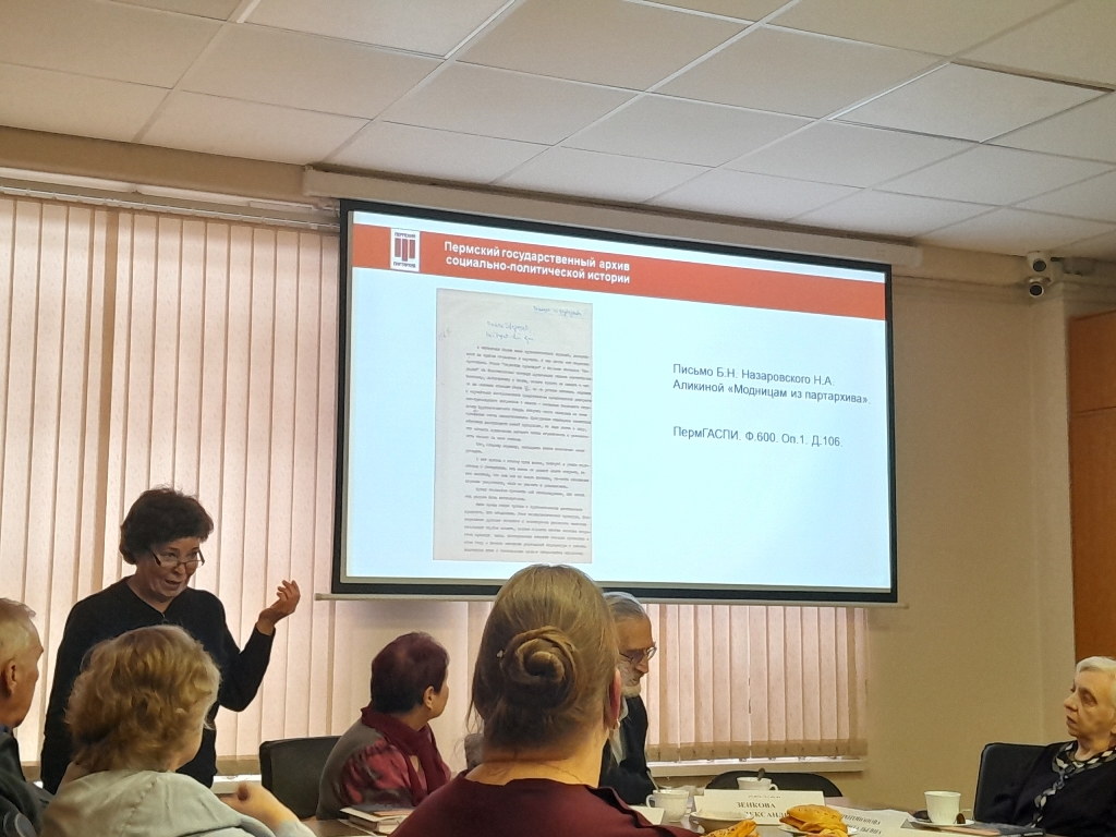 В ходе обсуждения наследия Н.А. Аликиной была отмечена ее роль для развития не только Пермского Партархива, но и для всей архивной отрасли и исторической науки региона. Светлана Юшкова рассказала о многолетнем общении Надежды Аликиной с Виктором Астафьевым и Марией Астафьевой-Корякиной, чей семейный фонд хранится в Государственном архиве Пермского края.