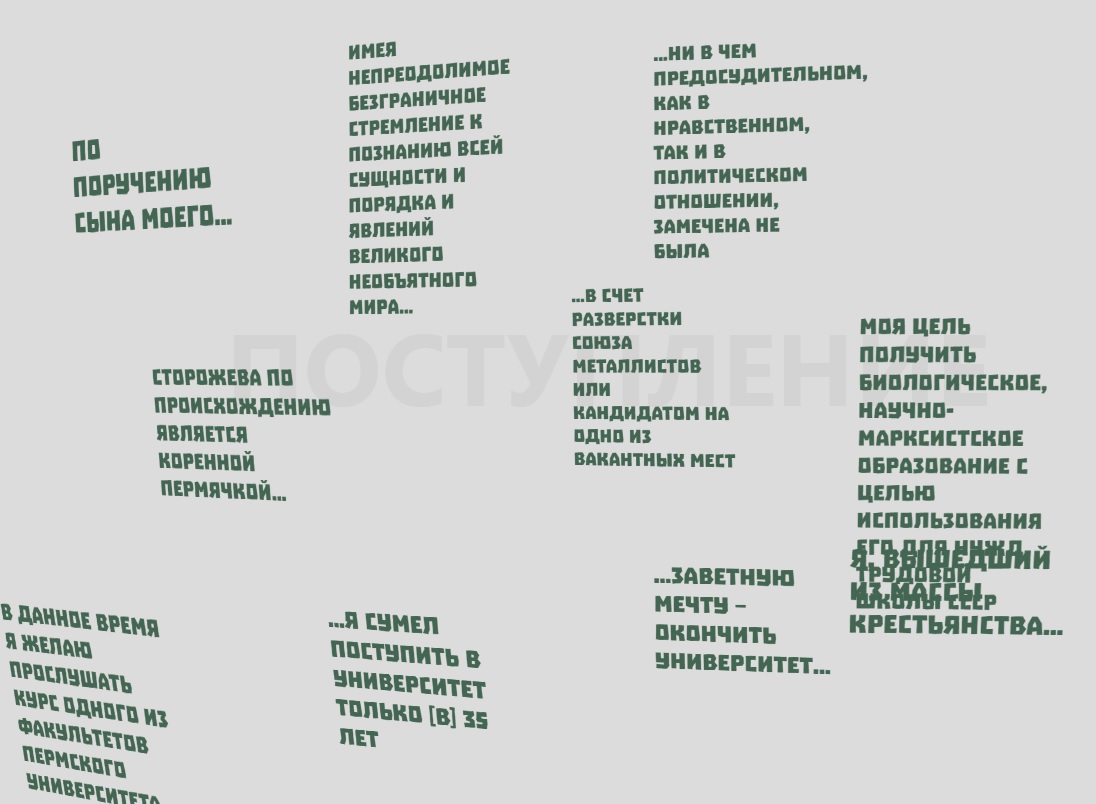 На выставке представлено 85 документов архивного фонда р-180 «Пермский государственный университет Министерства образования РФ (г. Пермь)», в котором хранится более 10 000 личных дел студентов. Большинство документов, вошедших в выставку, выявлено в личных делах студентов Пермского университета. Документы сгруппированы по тематическим разделам: «Поступление», «Личные документы студента», «Учебные вопросы», «Отчисление и восстановление», «Общественная жизнь», «Материальные трудности», «Здоровье студентов», «Совмещение учёбы с работой», «Студенты и военное время», «Фотографии студентов».