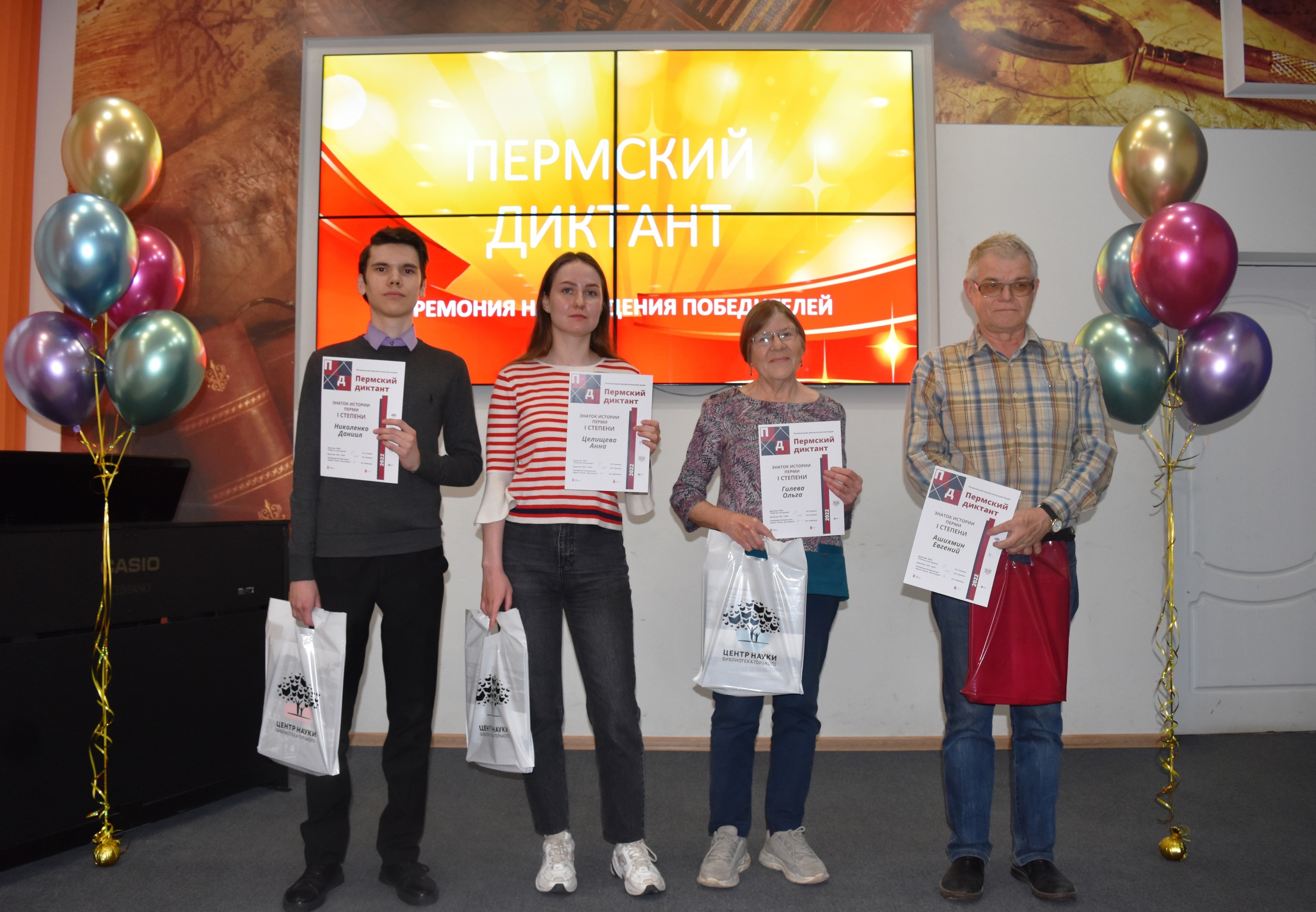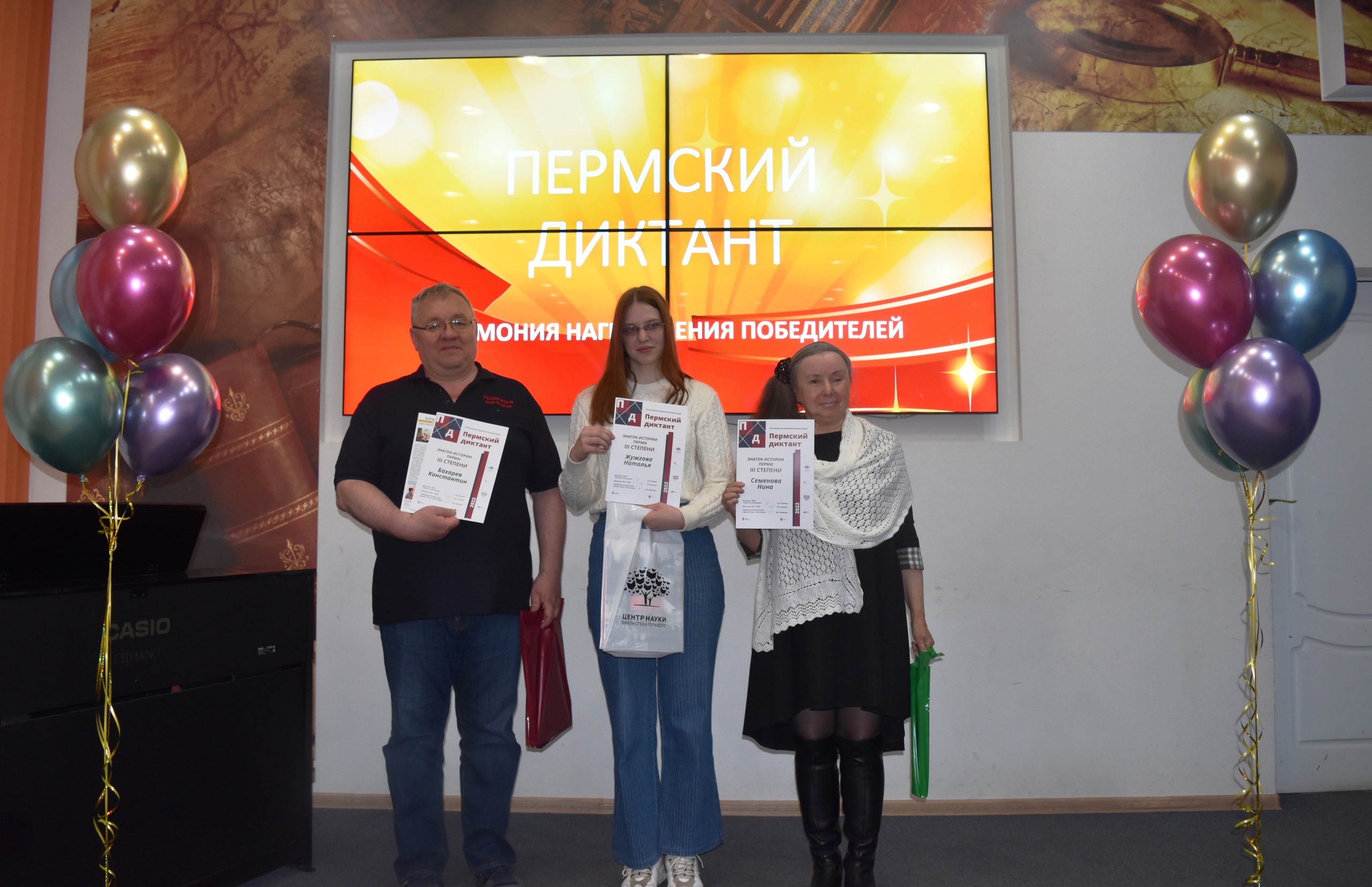 На церемонии награждения первые 25 знатоков по итогам рейтинга результатов получили дипломы и подарки от организаторов, от ГАПК были вручены фотоальбомы с видами города Перми, подготовленные совместно с архивом г. Дуйсбурга (ФРГ), все остальные получили сертификаты об участии в первом «Пермском диктанте».