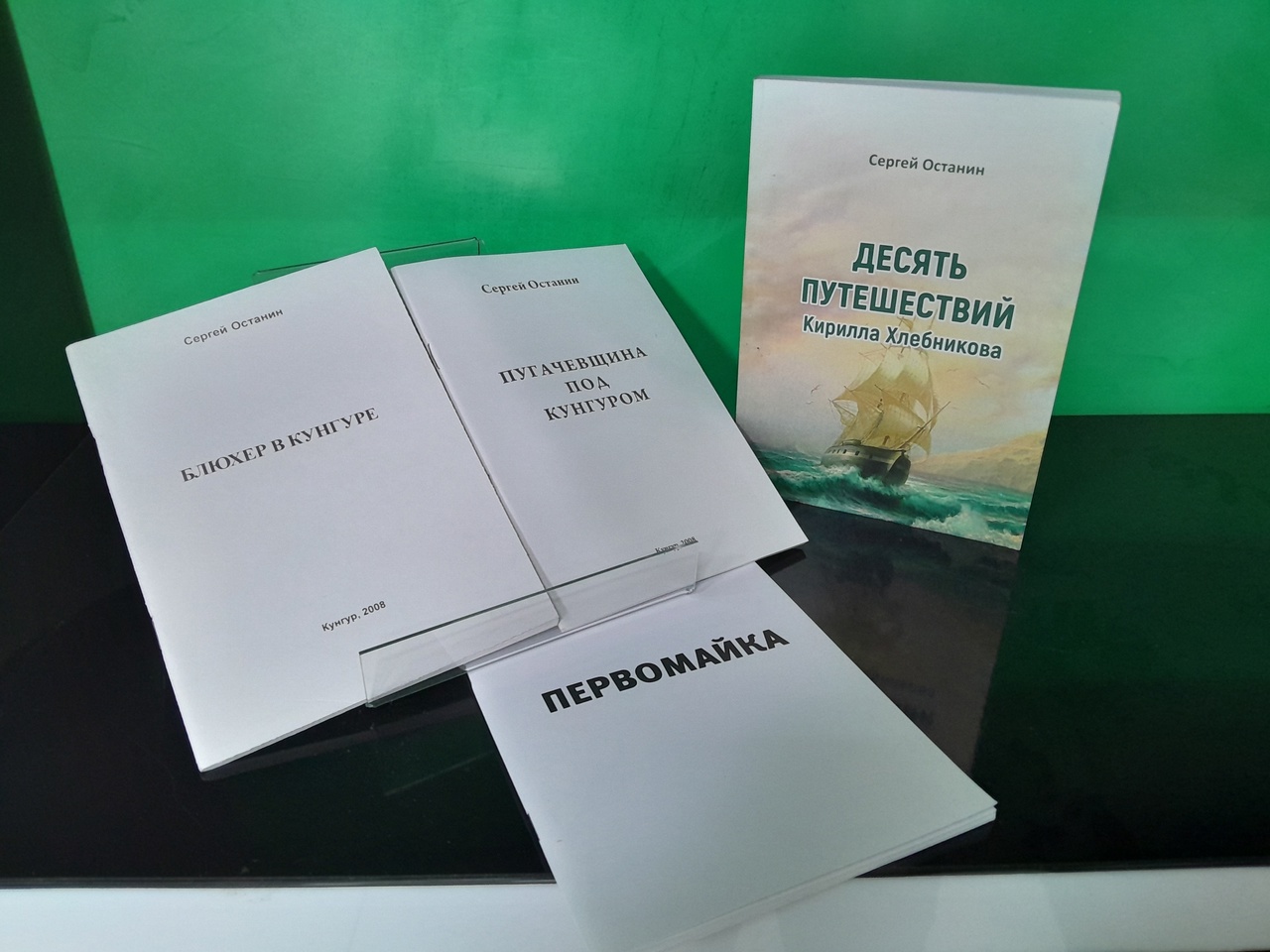 Ещё четыре книги об истории Кунгура и его окрестностей подарил архиву писатель и журналист Сергей Останин. Это издания «Пугачевщина под Кунгуром» и «Блюхер в Кунгуре», увидевшие свет в 2008 г., «Первомайка» (2023 г.) об истории кунгурского микрорайона Первомайский, и «Десять путешествий Кирилла Хлебникова», выпущенное в этом году.