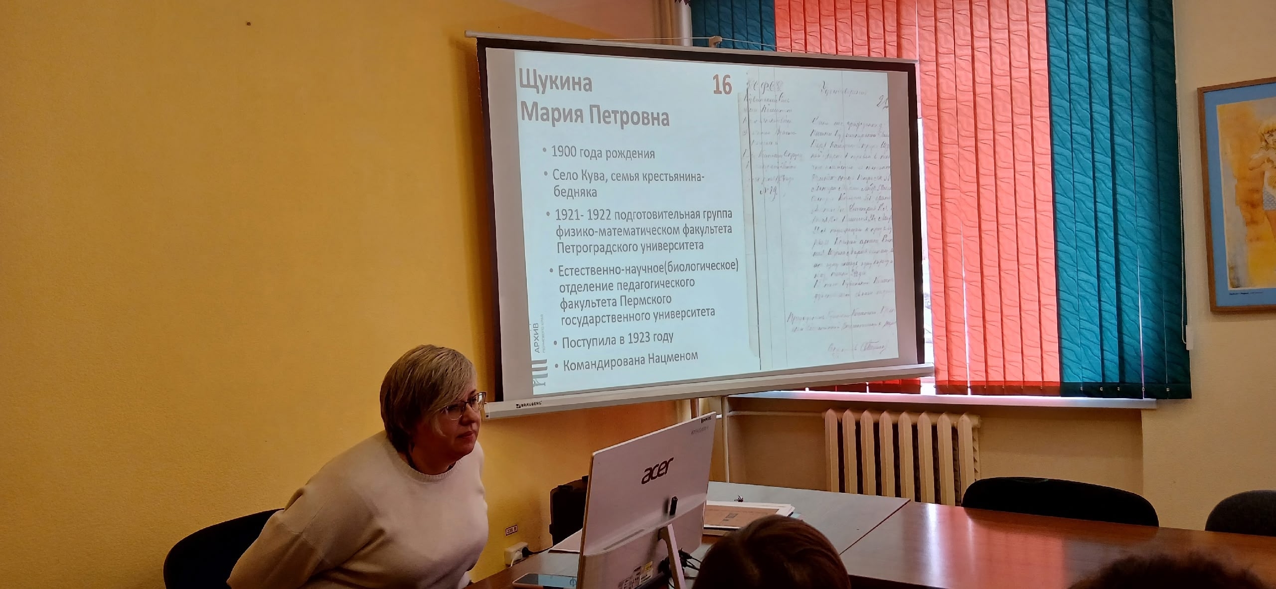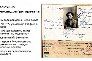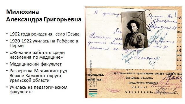 В своем выступлении Юлия Анатольевна через архивные документы показала судьбу 8 коми-пермяков, которые обучались в 1920-е годы в Пермском университете по разным направлениям. В фонде ГАПК «Пермский государственный университет» были выявлены дела студентов коми-пермяков: Жилкиной Е. (ГАПК. Ф.р-180. Оп.4. Д. 1083), Кудымовой (Пьянковой) (ГАПК. Ф.р-180. Оп.4. Д. 2892), Вилесовой Екат. (ГАПК. Ф.р-180. Оп.4. Д. 556), Милюхина Ал. (ГАПК. Ф.р-180. Оп.4. Д. 2134), Сторожевой М.М. (ГАПК. Ф.р-180. Оп.4. Д. 3334), Голевой Фаины (ГАПК. Ф.р-180. Оп.4. Д. 773), Голевой Анастасии (ГАПК. Ф.р-180. Оп.4. Д. 774), Пьянковой Екатерины (ГАПК. Ф.р-180. Оп.4. Д. 2893), Пономаревой Н. (ГАПК. Ф.р-180. Оп.4. Д. 2707), Щукиной Марии (ГАПК. Ф.р-180. Оп.4. Д. 4052), Баталова Андрея (ГАПК. Ф.р-180. Оп.4. Д. 207), Казанцев Серафим (ГАПК. Ф.р-180. Оп.4. Д. 1601), Лавров Василий (ГАПК. Ф.р-180. Оп.4. Д. 1803), Лунегова Василия (ГАПК. Ф.р-180. Оп.4. Д. 1921), Снегирева Георгия (ГАПК. Ф.р-180. Оп.4.Д. 3239), Субботина Бориса (ГАПК. Ф.р-180. Оп.4.Д. 3359), Сысолетина Федора (ГАПК. Ф.р-180. Оп.4.Д. 3404), Тараканова Федора (ГАПК. Ф.р-180.,Оп.4. Д. 3418), Зубова Андрея (ГАПК. Ф.р-180. Оп.4. Д. 4132).