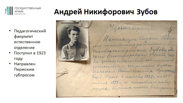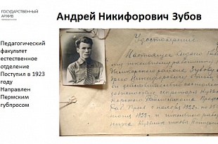 Так, например, впервые был представлен документ об обучении в Пермском университете Андрея Зубова - поэта, писателя, одного из основоположников коми-пермяцкой литературы. В конце 1920-х годов Зубов Андрей Никифорович окончил Пермский университет с квалификацией педагога по естествознанию и химии.