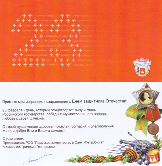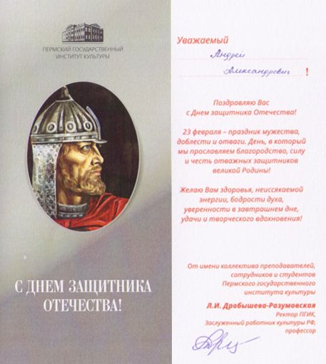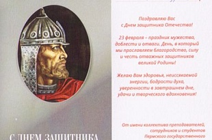 Коллектив Государственного архива Пермского края сердечно благодарит Вас за поздравления и в свою очередь также поздравляет Вас с наступающим Днем защитника Отечества – праздником мужества, благородства и чести!