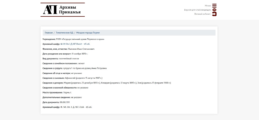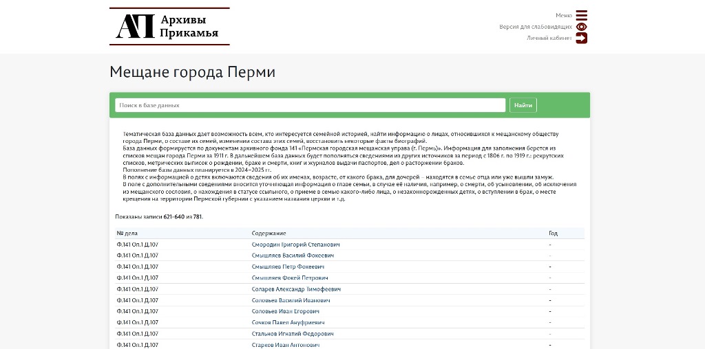 Новая база данных дает возможность всем, кто интересуется семейной историей пермских мещан, найти информацию о лицах, принадлежавших к мещанскому обществу, о составе их семей, изменении состава этих семей, восстановить некоторые факты биографий.