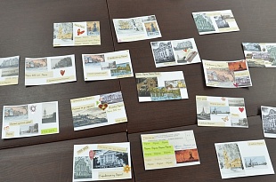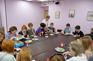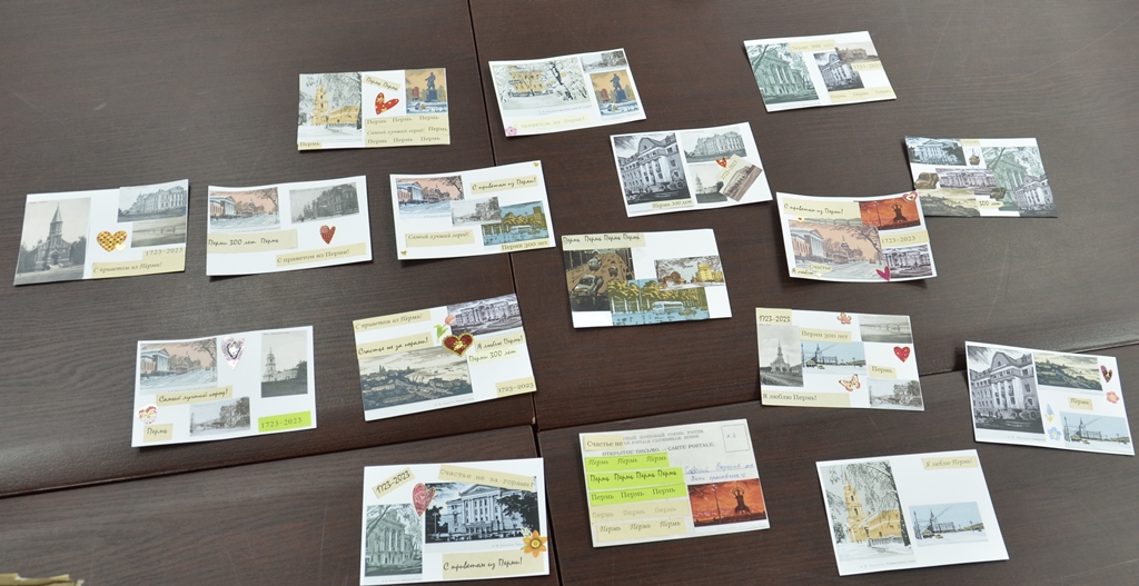 Начальник научно-исследовательского отдела Ирина Демина и заместитель начальника научно-исследовательского отдела Ольга Гирева провели для ребят мастер-классы по изготовлению памятной открытки к юбилею города Перми. При изготовлении своих открыток ребята использовали копии изображений гравюр народного художника России Александра Петровича Зырянова с достопримечательностями Перми. Каждый участник тематического занятия с огромным удовольствием смастерил свою неповторимую открытку, посвященную юбилею родного города, и получил её на память.