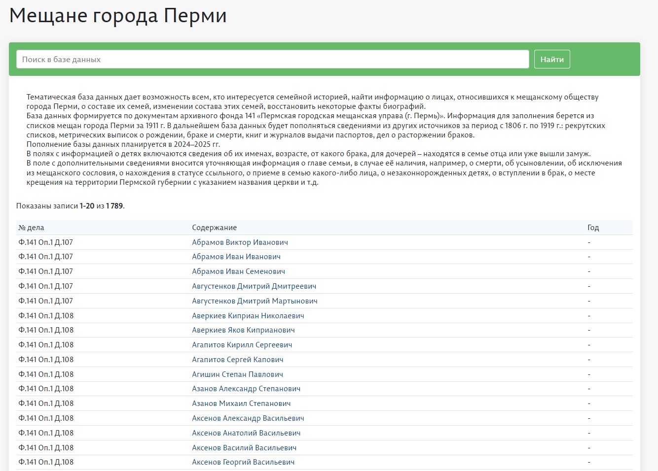 База данных «Мещане города Перми», позволяет оперативно находить информацию о лицах, принадлежавших в конце XIX – начале XX века к пермскому мещанскому обществу. Для наполнения базы данных используются документальные материалы архивного фонда 141 «Пермская городская мещанская управа» – посемейные списки мещан за 1911 год. Эти документы содержат информацию о составе семей, возрасте членов семьи, отношении мужчин к воинской обязанности, сведения о датах рождений, бракосочетаний, смертей, сведения о переходе в другое сословие, смене места жительства и другие. Посемейные списки дополняют такие важные в генеалогическом поиске источники, как метрические книги церквей.