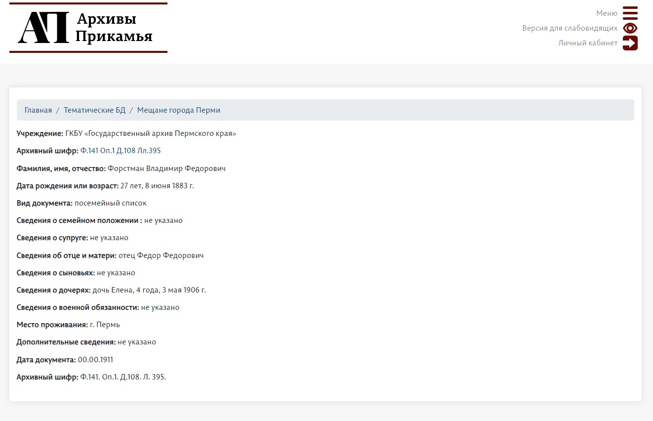 Тематическая база данных Государственного архива Пермского края «Мещане города Перми», размещенная на портале «Архивы Прикамья», пополнилась новыми 358 записями. Всего в базе данных теперь содержится информация на 1789 человек. Ресурс является общедоступным, для его просмотра не требуется регистрация.