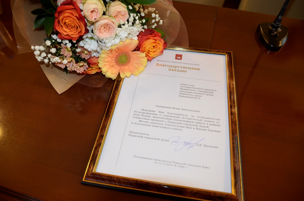 В завершении встречи председатель Пермской городской Думы Дмитрий Малютин вручил Благодарственные письма. За сотрудничество по возрождению и сохранению исторической памяти города Перми, многолетнюю плодотворную работу в рамках совместных проектов с Пермской городской Думой благодарственным письмом была награждена директор Государственного архива Пермского края, кандидат исторических наук Юлия Кашаева.