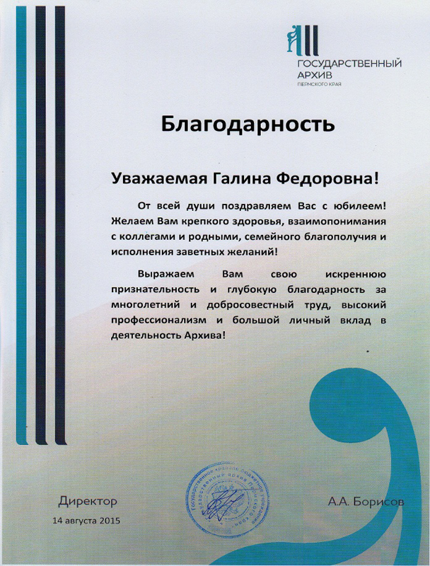Архив выражает свою искреннюю признательность и глубокую благодарность за многолетний и добросовестный труд, высокий профессионализм и большой личный вклад в деятельность Государственного Архива Пермского края.