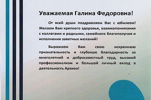 Сотрудники Краевого архива от всей души поздравляют Галину Федоровну с юбилеем! Желают крепкого здоровья, взаимопонимания с коллегами и родными, семейного благополучия и исполнения заветных желаний.