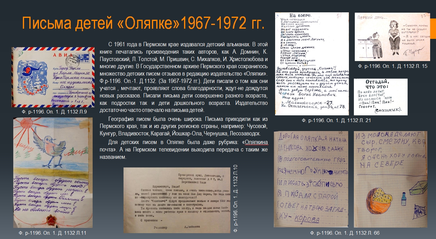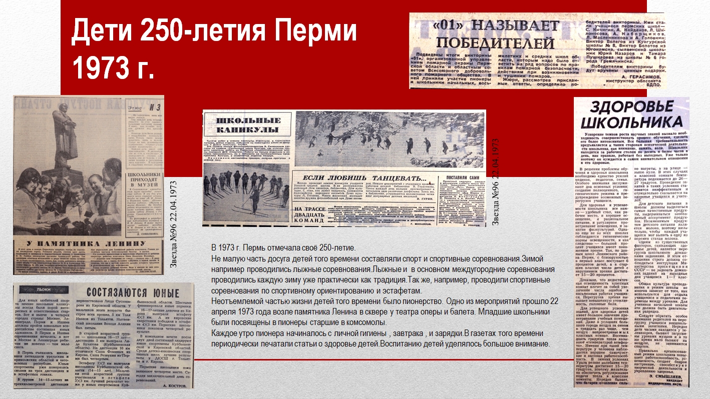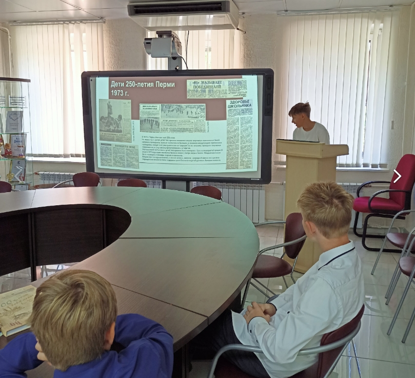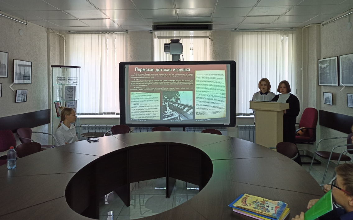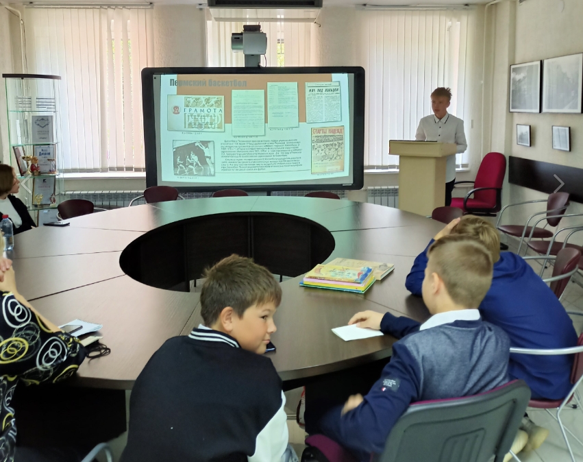 Со своими сообщениями выступили ученики 7 «Б» класса – Варвара Быкова, Иван Волегов, Арсений Лапшин, Арина Ростовщикова, Даниил Спиров, Алена Туева, Ярослав Чухланцев, Иван Маслов. Проекты ребят были посвящены досугу пермских детей в XX веке и были подготовлены на основе архивных документов. Учащиеся изучили и представили следующие темы: «Дети 250-летия Перми. 1973 г.», «Пермский баскетбол», «Письма детей «Оляпке». 1967–1972 гг.», «Сад им. А.А. Горького. 1950–1980 гг.», «Пермская детская игрушка», «Лыжный поход Молотов – Свердловск. 1941 г.». Во время выступлений ребята подробно рассказали о целях, поставленных перед началом исследования, об архивных источниках, которые они изучили, поделились собранной по теме исследования информацией. После сообщения каждый выступающий подробно ответил на вопросы, которые возникли у слушателей.