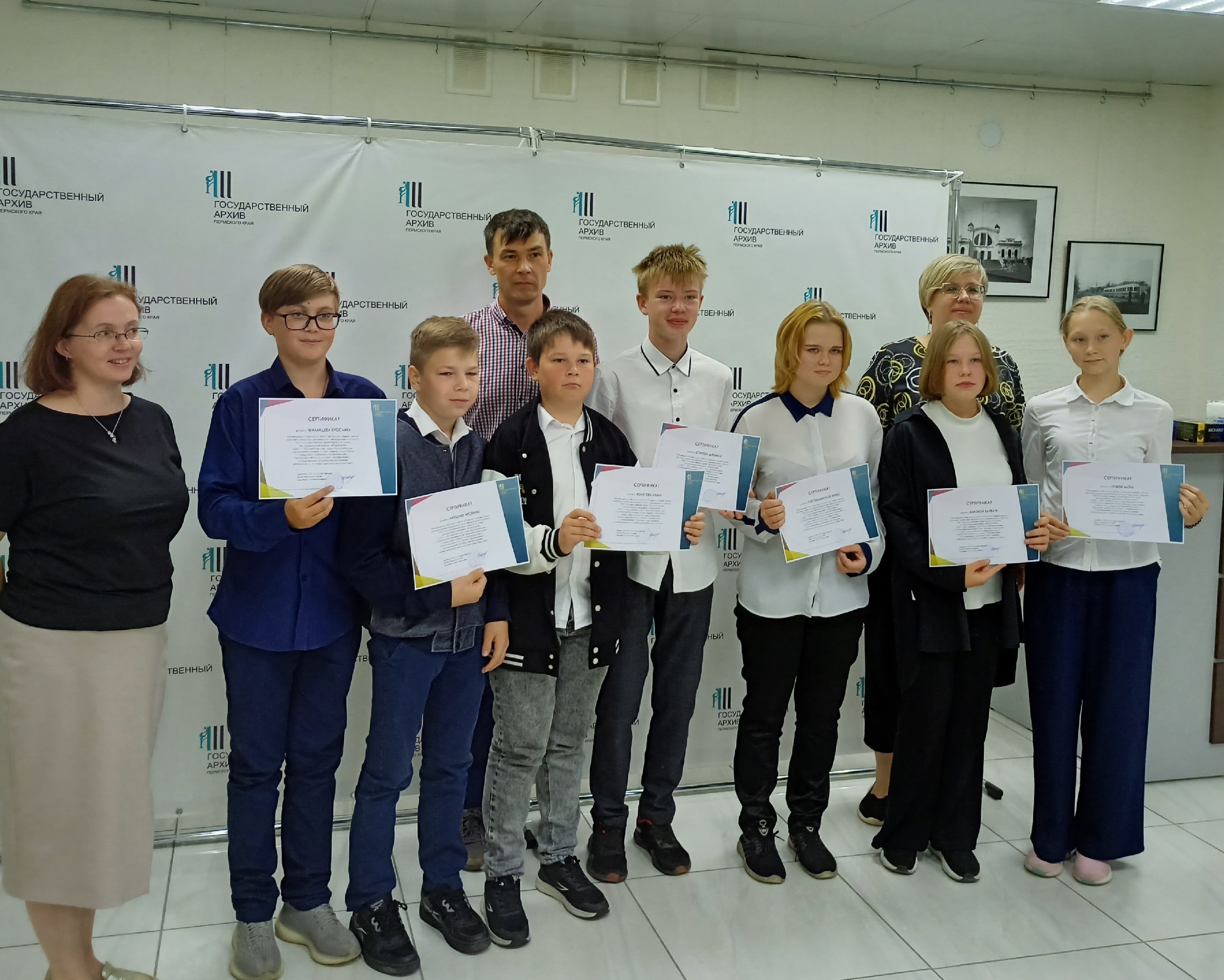 За успешную разработку учебно-исследовательских тем директор Государственного архива Пермского края Юлия Кашаева торжественно вручила школьникам и их руководителю учителю истории Евгению Волегову сертификаты участников проекта. В завершении встречи участники проекта «Архивная лаборатория» поделились своими впечатлениями о работе в архиве и высказали пожелания о продолжении встреч.