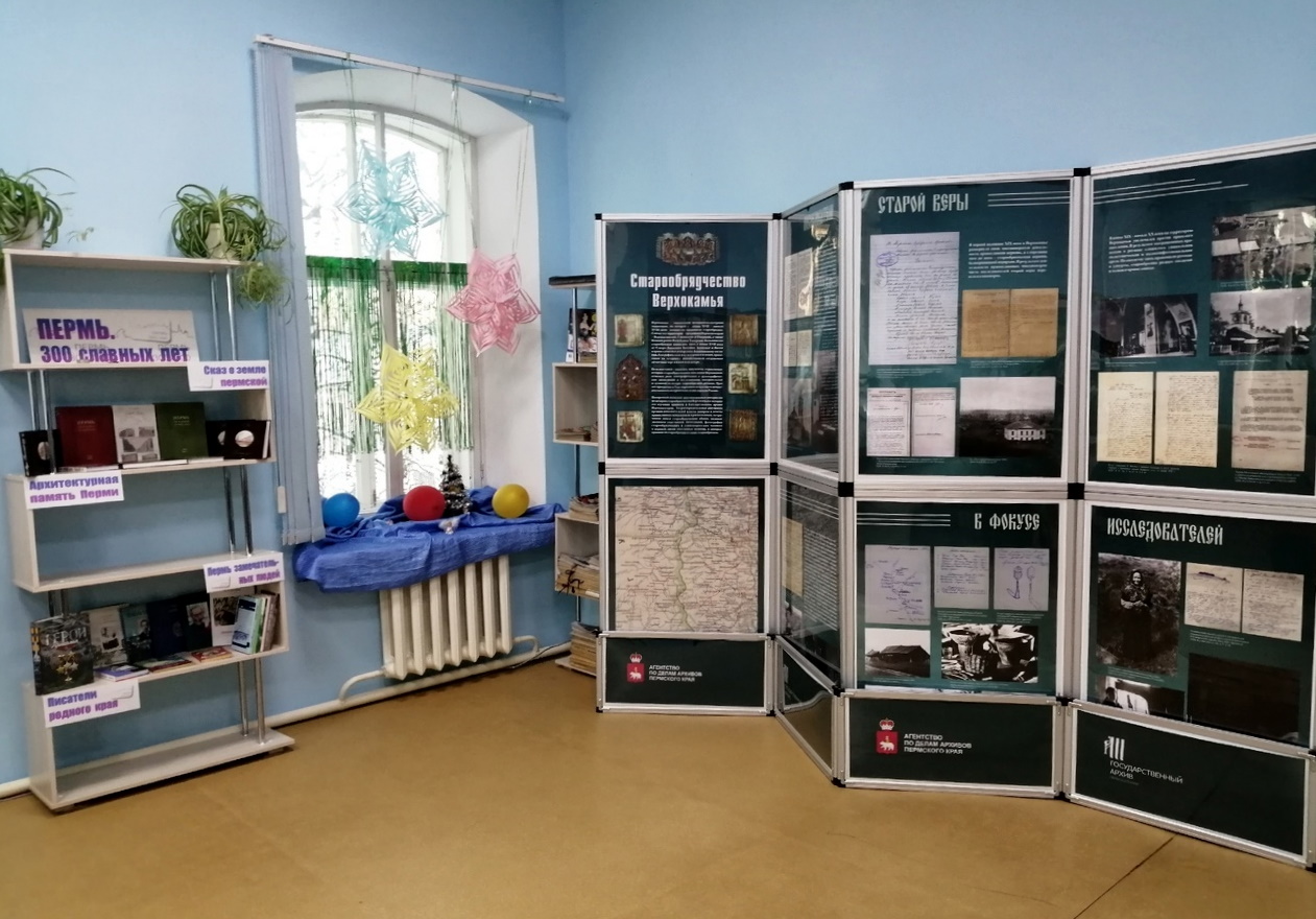 С 12 января по 17 февраля в читальном зале Большесосновской межпоселенческой центральной библиотеки (Пермский край, с. Большая Соснова, ул. Школьная, д. 1) представлена передвижная выставка архивных документов и материалов «Старообрядчество Верхокамья». Выставка была подготовлена Государственным архивом Пермского края в 2022 г. и приурочена к Году народного искусства и нематериального культурного наследия народов России.