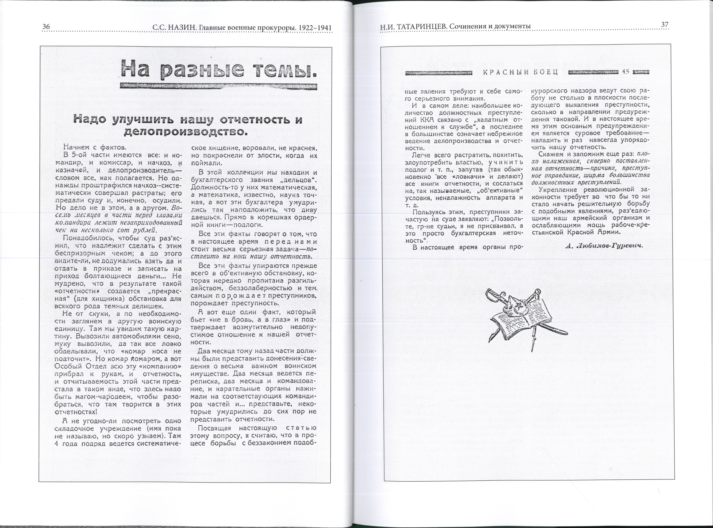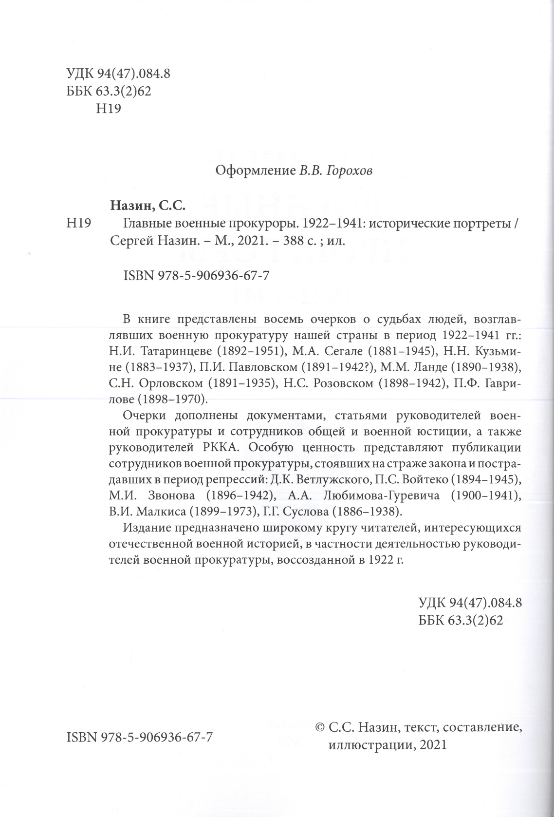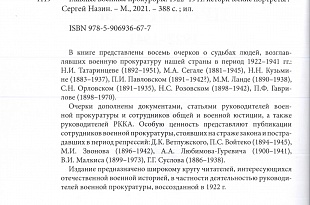 В книге представлены восемь очерков о судьбах людей, возглавлявших военную прокуратуру СССР в период 1922–1941 гг. Исторические очерки дополнены документами, статьями руководителей военной прокуратуры и сотрудников общей и военной юстиции, а также руководителей РККА. Автор книги, историк Сергей Станиславович Назин, отмечает, что «по подбору и количеству опубликованных статей и документов (55 единиц) книга в некотором роде может претендовать на хрестоматию по курсу истории государства и права советского периода».