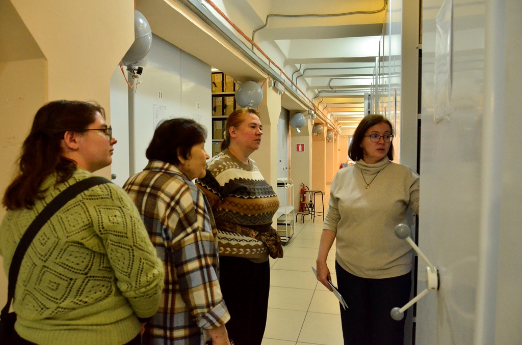 В ходе экскурсии гости познакомились с условиями хранения документов, процессом оцифровки и реставрации архивных дел. Специально к встрече была подготовлена подборка документов по истории династии художников. Гостям были представлены ревизские сказки и городовая обывательская книга по городу Перми с записями о семье Петра Прокопьевича Верещагина, метрические книги с записями о рождении и крещении в Рождество-Богородицкой церкви города Перми Петра и Василия Верещагиных, письмо художника Владимира Александровича Плотникова, родственника Верещагиных, о передаче в дар Пермскому научно-промышленному музею портретов, написанных В.П. Верещагиным и им самим, другие документы. Гости смогли лично ознакомиться с артефактами по истории семьи, увидеть подлинные подписи предков, прочитать составленные о них или ими самими документы. Впечатлили гостей и выявленные в краевом архиве материалы о жизни деда Василия Верещагина - живописца Ивана Бабина, принимавшего участие в написании икон для мраморного иконостаса Пермского Спасо-Преображенского кафедрального собора.