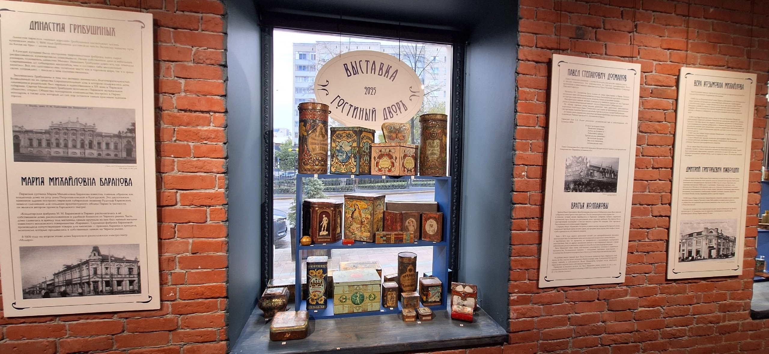 Одна из крупнейших коллекций упаковки принадлежит пермскому предпринимателю и коллекционеру, основателю частного «Музея упаковки» Максиму Ожегову. Экспонаты из его коллекции и стали основой выставки, которая представляет зрителю художественно оформленную атмосферу Гостиного двора дореволюционной эпохи России.