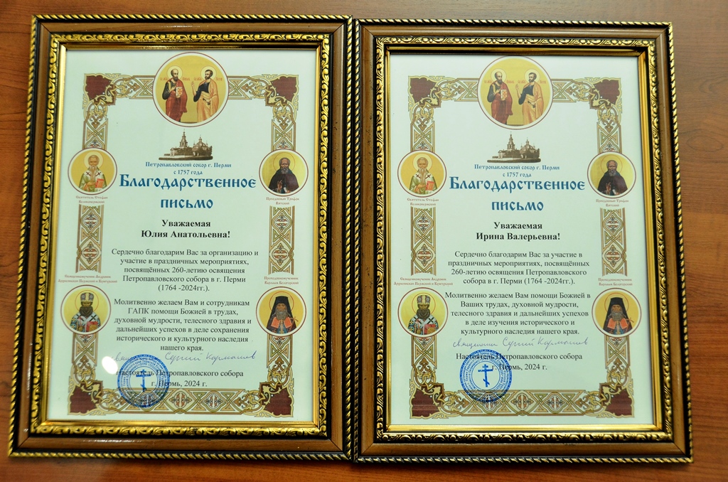 В рамках Лектория состоялось открытие выставки «Ровесник города Перми: история Петропавловского собора 1724-2024 гг.», подготовленная Государственным архивом Пермского края. Открыли выставку настоятель Петропавловского собора о. Сергий и к.и.н, директор ГАПК Юлия Кашаева. Передвижная выставка расположилась на 8 планшетах, которые посвящены истории возникновения собора и его архитектурным особенностям, времени забвения и возрождения храма. Отдельный стенд рассказывает о служителях Петропавловского собора, о Гаврииле Сапожникове и Федоре Петровиче Делекторском.