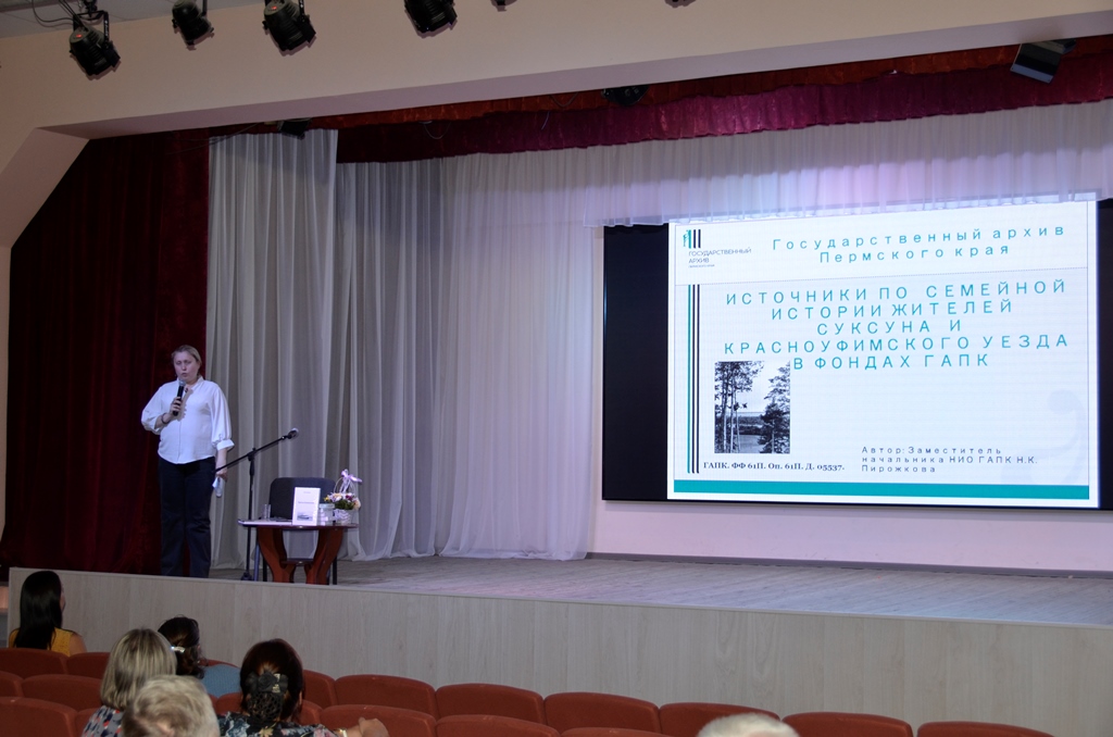 Юлия Кашаева рассказала о работе ГАПК над архивными и краеведческими исследованиями, представила издания. Особое внимание руководитель архива уделила новому фотоальбому «Пермь на планах города: три века роста», которое было выпущено специально к празднованию 300-летия краевой столицы. Наталья Пирожкова погрузила участников презентации в тему генеалогических поисков об истории жителей Суксуна. В завершении мероприятия пермские архивисты передали Суксунскому краеведческому музею книги, изданные ГАПК.