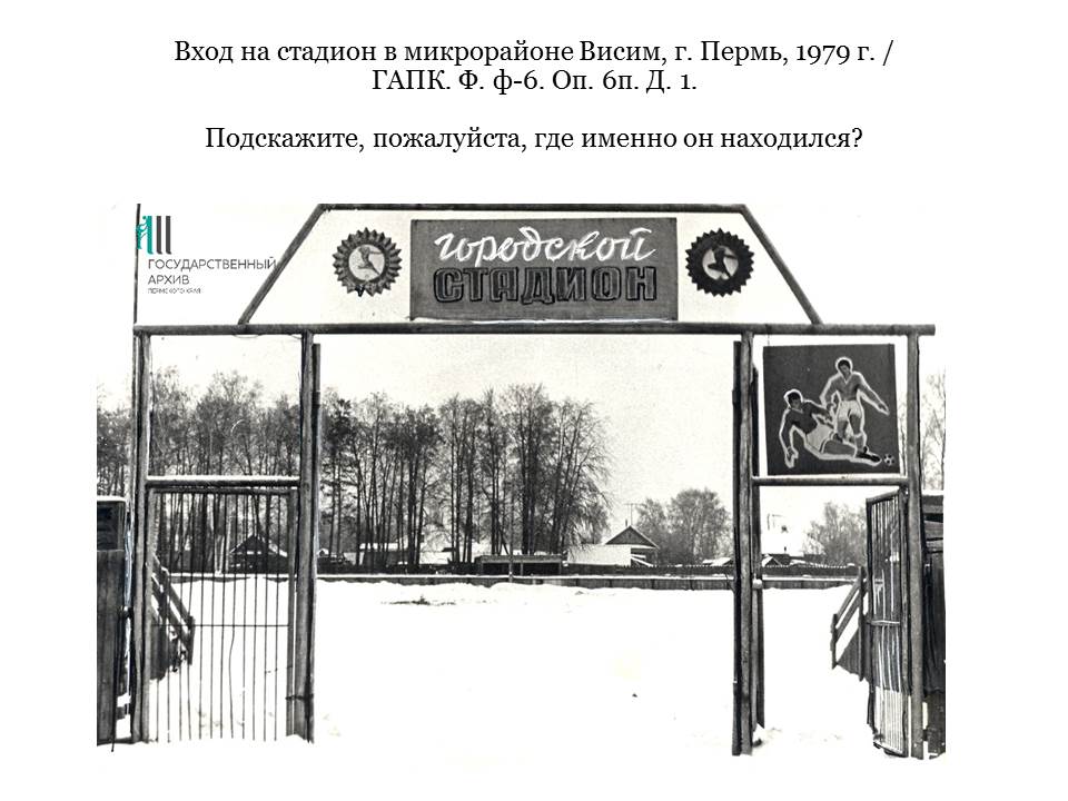 В ходе встречи наибольший интерес участников вызвал вопрос о стадионе, изображенном на одной из фотографий фонда ф-6. под общим названием «Вход на стадион в микрорайоне Висим, г. Пермь, 1979 г.». Архивисты предложили присутствующим уточнить место, название и период существования стадиона, находившегося некогда на территории микрорайона. Загадка была раскрыта: по воспоминаниям жителей стадион «Буран» находился на пересечении улиц Урицкого и Алексеевской и является одним из первых спортивных объектов Мотовилихи. Сегодня стадион находится в запустении. В описание фотодокумента архивом будет внесено уточнение.