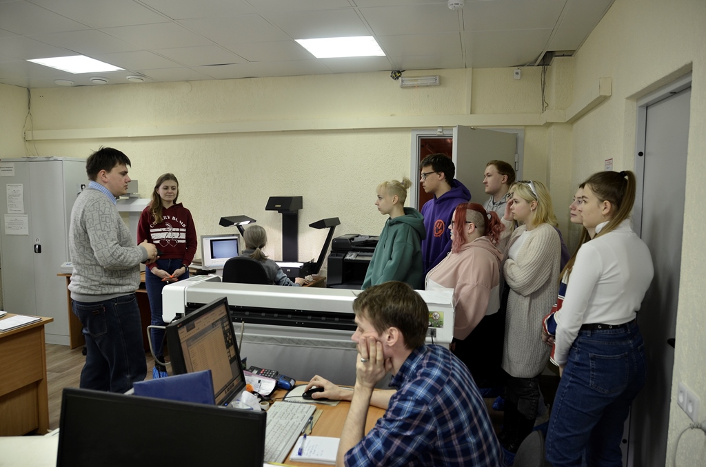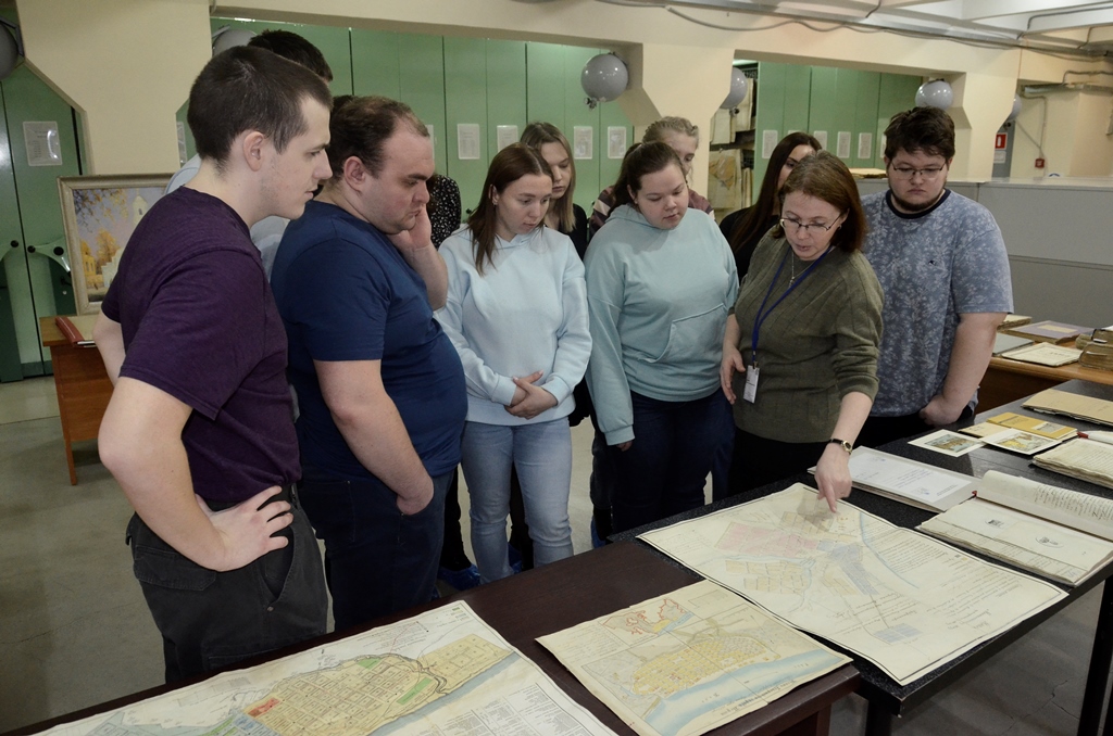 Начальник научно-исследовательского отдела Ирина Демина и главный археограф научно-исследовательского отдела Владимир Арестов провели для студентов экскурсию в хранилище картографических документов и в лабораторию оцифровки архивных документов, в которой и ведется сканирование планов, карт и чертежей из фондов архива.
