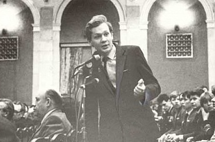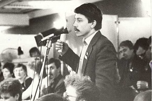 В Перми проходила XXIII областная отчетно-выборная комсомольская конференция. На фото: секретарь комитета ВЛКСМ Пермской ГРЭС К.Боровиков; председатель городского клуба воинов-интернационалистов и призывников "Саланг" А.Мокрецов у "свободного" микрофона