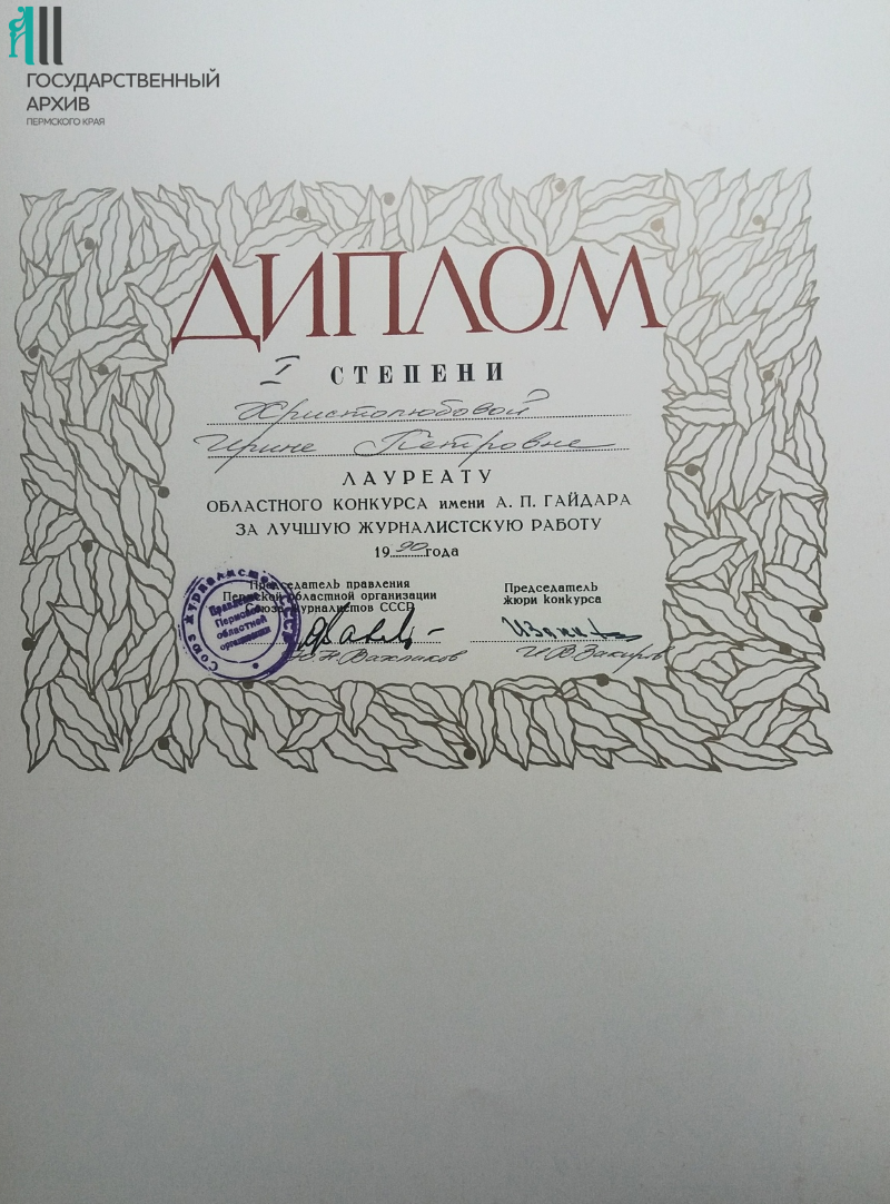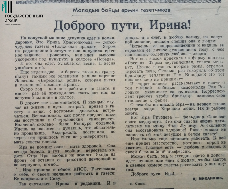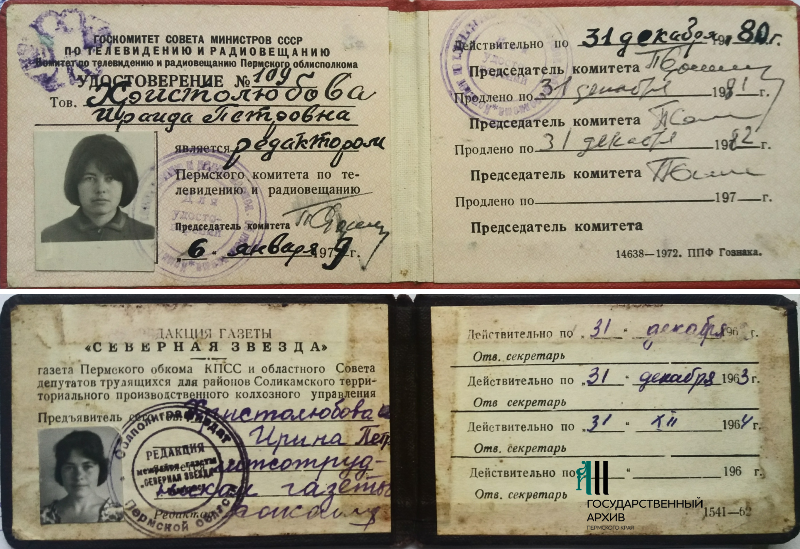 В Государственном архиве Пермского края хранится личный фонд И. П. Христолюбовой р-1783: http://www.archive.perm.ru/catalog/2529-khristolyubova-irina-petrovna-rod-1938-g-zhurnalist-pisatel/